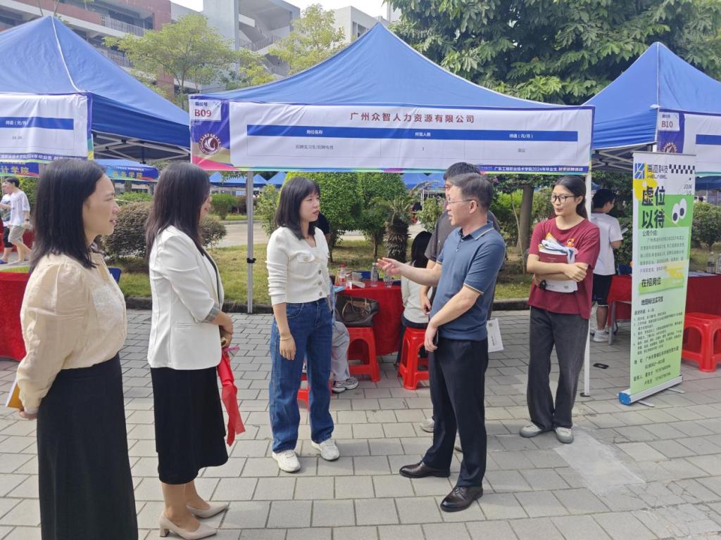 为全面贯彻落实党中央、国务院“稳就业、保就业”决策部署,深化校企合作,精准对接企业需求,促进毕业生高质量就业,10月30日,商务学院开展“访企拓岗促就业”系列活动。在广东工程职业技术学院2024年毕业生秋季招聘活动中,商务学院院长刘迎春和学院党委副书记石来斌来到广州校区招聘会现场同各参会单位深入交流,了解用人需求和招聘计划,进一步挖掘就业岗位,并指导2025届毕业生的就业工作。同时,还与毕业生同学们亲切交流,鼓励同学们充分发挥自身优势,大胆尝试,找到适合自身的就业发展平台。