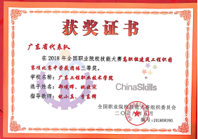 本专业重视学生综合能力和综合素质的培养,形成了基于产教融合、协同育人理念的复合型人才培养模式。培养的学生综合素质高、创新能力强,数百人次在国家级、省级的技能大赛中屡创佳绩。如 “2018年全国职业院校技能大赛高职组建筑工程识图”三等奖、“2021-2022 年度广东省职业院校学生专业技能大赛建筑装饰技术应用赛项”一等奖等。