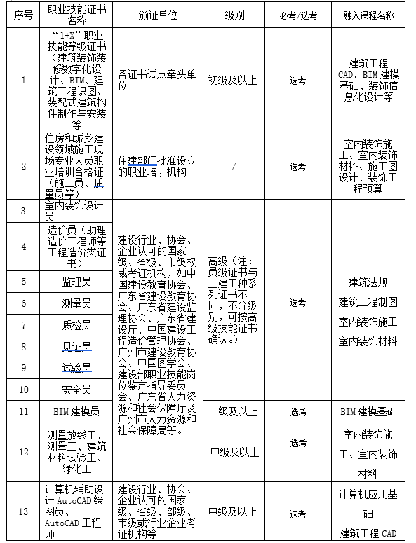 针对不同岗位,学生可以在校期间明确各人就业岗位意向,考取相对应的职业技能证书,比如建筑装饰装修数字化设计、BIM建模员、施工员、监理员、安全员、材料员、质检员、资料员等。