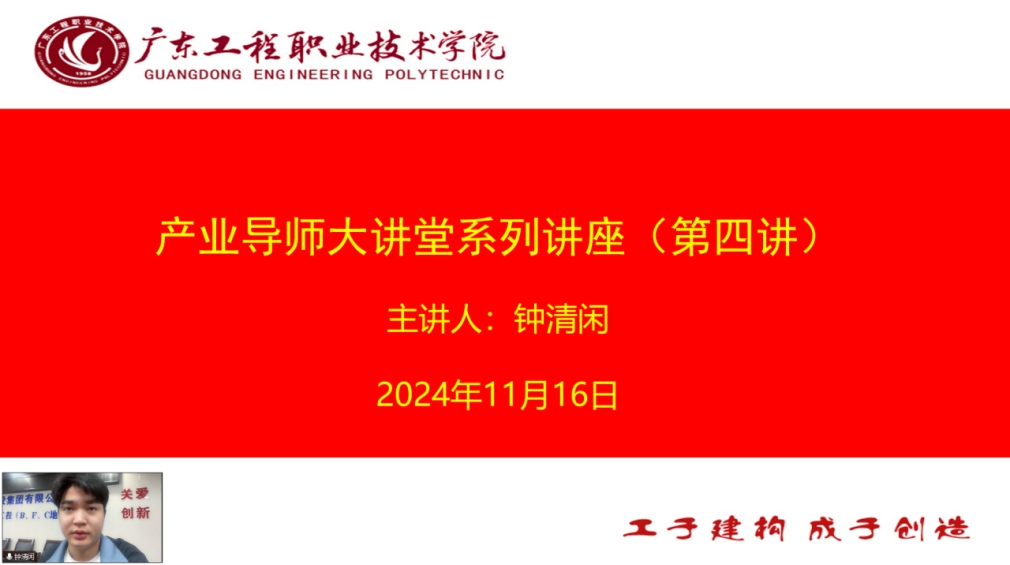 第四讲中,产业导师钟清闲以自己技能改变命运的成功经历为例,从选择大于努力;机遇成就人生;业无高卑志当坚、男儿有求安得闲;抓住机遇、不让青春留下遗憾;技能舞台显身手、获企业破格引进;技能技术创新,工作取得成绩;弘扬劳模精神、工匠精神;人生没有极限、年轻需要挑战等8个方面分享了自己学习中、备赛中、工作中的点点滴滴,分享了不断努力、潜心钻研的奋斗经历。