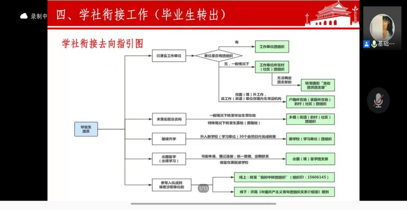 会上,向焚对共青团的重点工作做了具体安排,并对团费缴纳、青年大学习、学社衔接(毕业生团籍转出)三方面中出现的问题进行强调补充,对工作中出现的问题进行答疑解惑,强调了各团支部书记工作的重要性。会上要求各班团支书作为信息员,需每日落实团支部(班级)舆情风险每日报告制度,每日下午17:30前报告舆情情况,做到无事报平安,有事详细报告,充分发挥信息员的作用。随后,团总支基础团务部部长陈梓浩对毕业生团籍转出的指引及具体操作流程进行了培训讲解,引导各团支部书记更好的开展团籍转出工作。