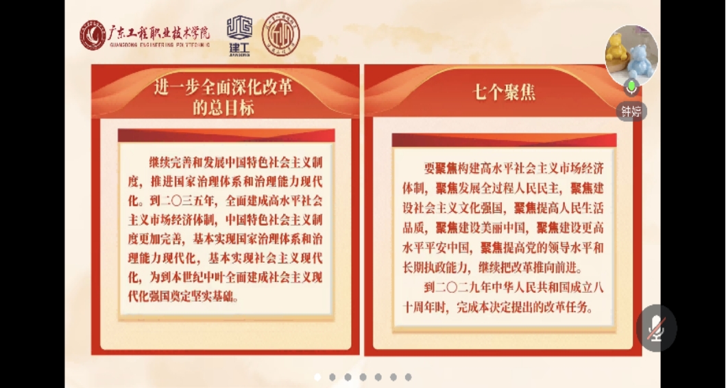 随后学院党委书记钟婷就学习贯彻党的二十届三中全会精神开展了领学并向全体党员传达了《中国共产党第二十届中央委员会第三次全体会议会报的指示精神。在领学过程中,她强调:两支部全体党员要深入学习习近平总书记关于全面深化改革的一系列新思想、新观点、新论断完整准确贯彻新发展理念要求,在学习上坚持解放思想、实事求是、守正创新、求真务实的进取精神,在工作中更加注重系统集成、更加注重突出重点,更加注重成果实效,积极将新发展理念学校高质量发展深度融合,在新形势下不断深化我院“匠心育人 铸魂强基”党建文化品牌建设,助力学校建高升本长足发展。