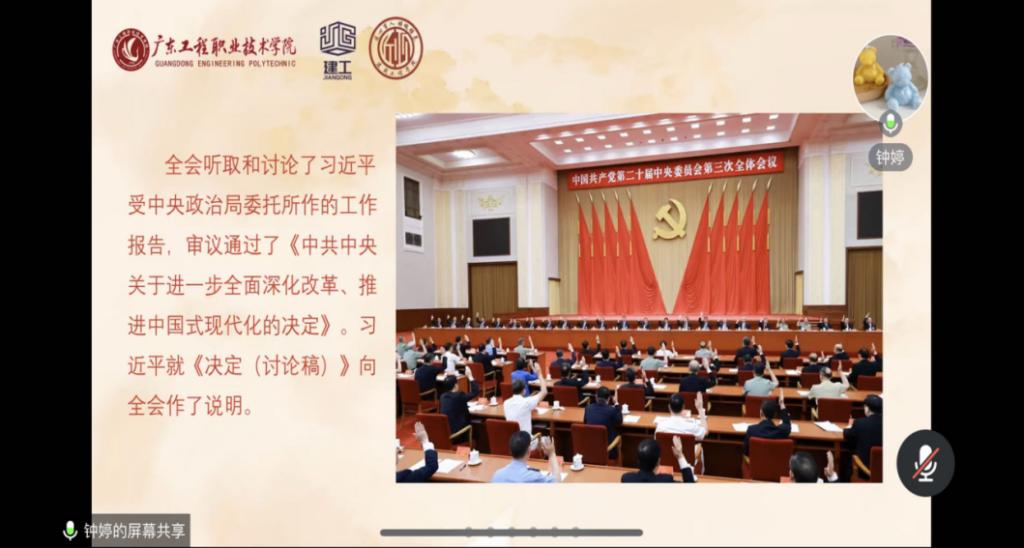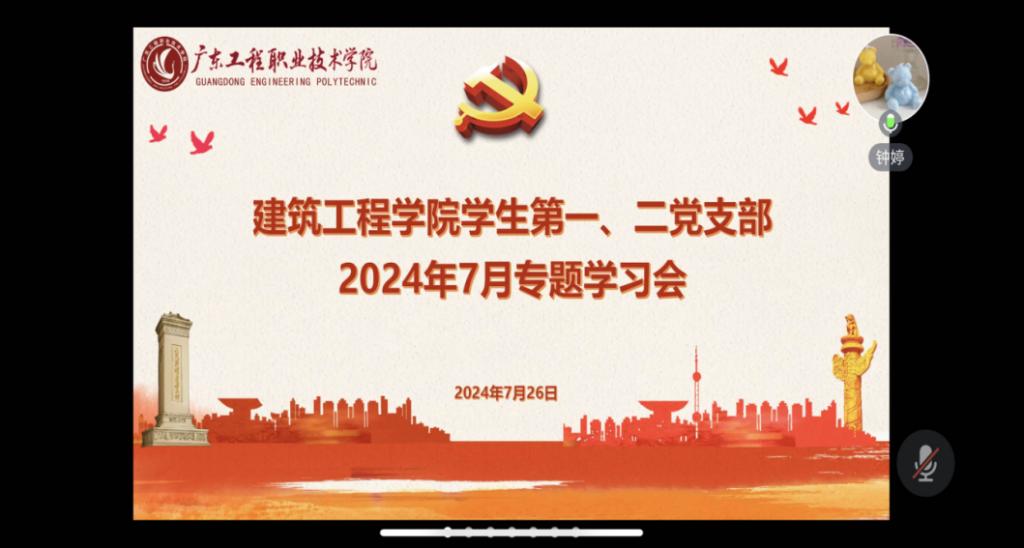 贯彻落实党的二十届三中全会作出的战略部署深度落实基层党组织对全会精神的学习领会,建筑工程学院学生第一、第二党支部于2024年7月26日晚通过腾讯会议的形式召开了党的二十届三中全会精神专题学习会。学院学生第一、第二党支部全体师生党员参会,会议学生第一党支部书记张伟群主持。
