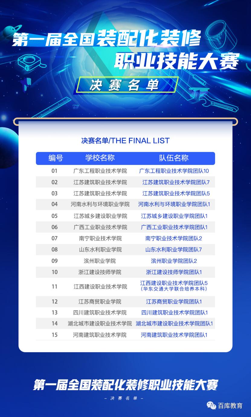 比赛包含装配化装修理论知识考试(8月5日8:30—9:30)与装配化装修工艺仿真流程操作考核(8月5日10:00—12:00)两个部分,两部分考核成绩均实行百分制,各占总成绩的50%。