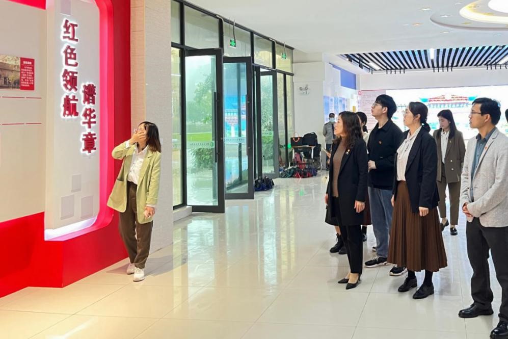 在机电工程学院党总支书记朱翠衡的带领下,大家参观了该校的中国共产党精神谱系基地以及智慧党建中心。在参观过程中,朱翠衡书记详细地讲解了园区以及展馆的设计理念和文化内涵,尤其是在智慧党建中心的参观过程中,更是生动地展示了各种融媒体党建文化特色成果,置身其中的感受令人印象深刻。