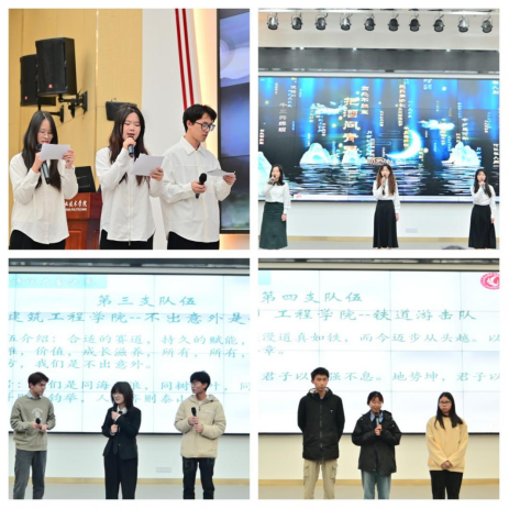 随后,四支决赛队伍依次进行了团队风采展示。“建工我们超队”、“人民当家作组队”、“不出意外是一队”、“铁道游击队”通过激情澎湃的团队口号、声情并茂的诗词朗诵和独具匠心的才艺表演等形式,展现了各自的团队特色与凝聚力,赢得了台下观众的阵阵掌声。