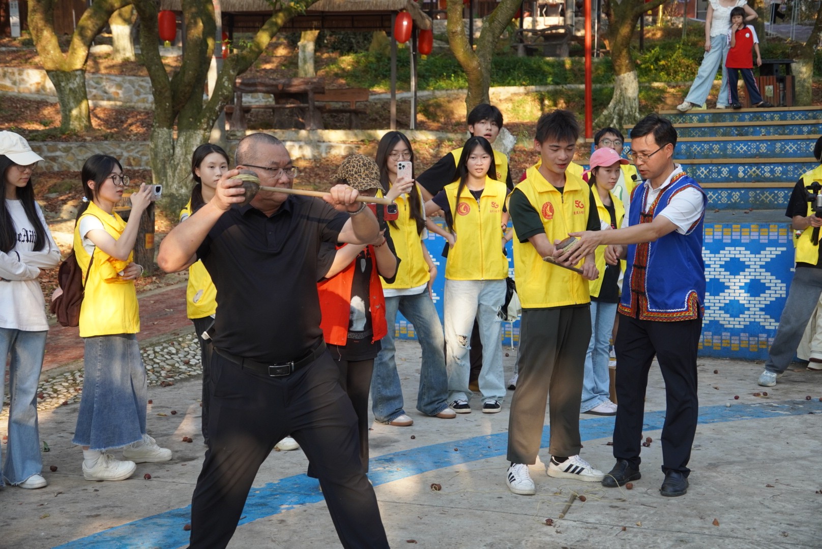 在省级文物保护单位泰华楼前,驻村第一书记晋保山向突击队讲述了这座百年围楼的营建智慧与畲族迁徙史,播下传承民族文化的种子。“陀螺一转,烦恼消散!”村支书蓝广西现场展示畲族打陀螺技艺时强调,“非遗不仅是技艺,更是滋养孩子心灵的乡土教材”。在畲乡独特的非遗文化影响下,突击队队员们纷纷穿上凤凰纹饰畲服感受当地风土人情,上场学习打陀螺技艺,沉浸式感知文化魅力,增强文化认同感。
