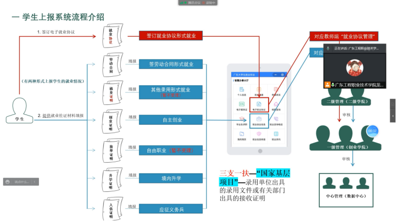 会上,晋保山首先介绍了学院2022届毕业生基础数据及就业现状,也指出了毕业生就业数据中存在的一些问题。毕业班辅导员龙洁爽随后围绕就业创业信息上报流程、签订电子就业协议流程等内容,细致地讲解了如何在“广东大学生就业创业”微信公众号上高效填报就业创业信息。黄沛峰接着强调了毕业生就业的意义、填报就业数据的重要性,并在线详细解答了有关学生的提问。