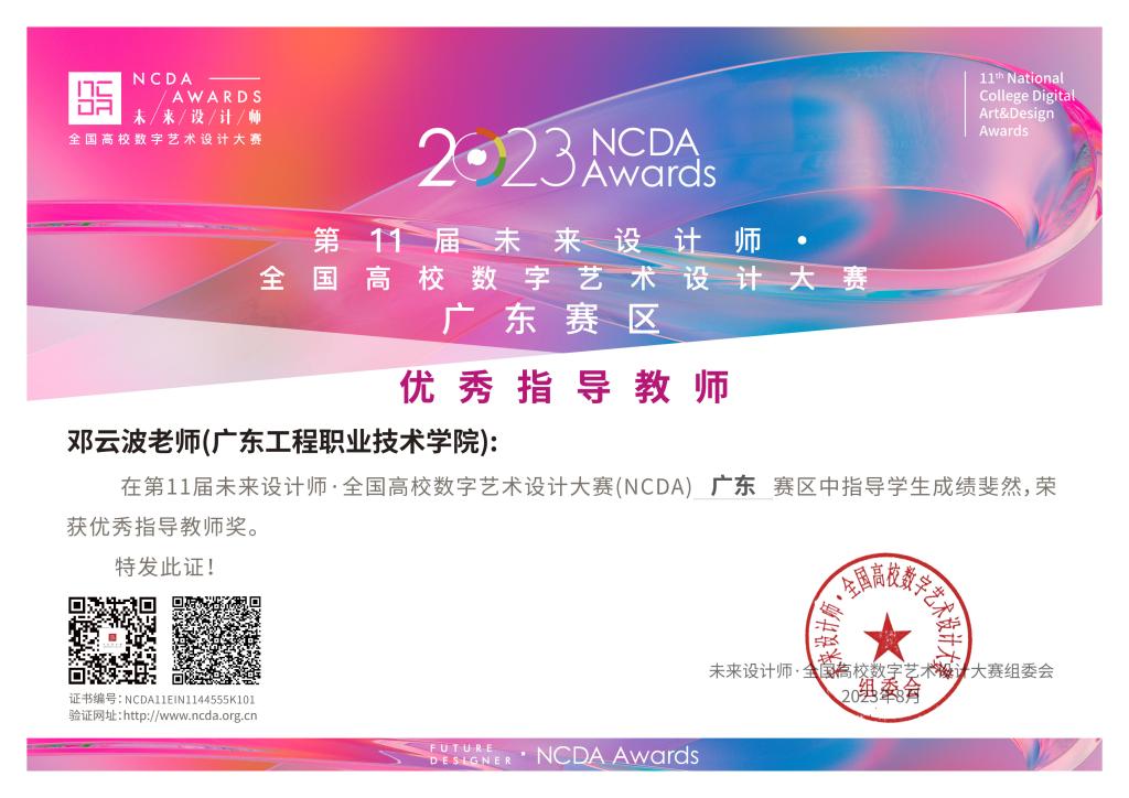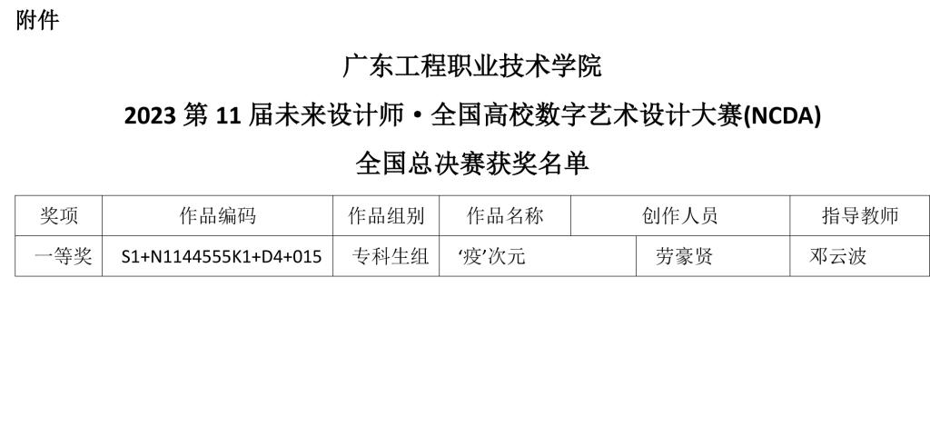 近日,2023 第 11 届未来设计师·全国高校数字艺术设计大赛(NCDA)全国总决赛落下帷幕,由建筑工程学院建筑室内设计专业教师邓云波指导的作品《‘疫’次元》在近29万件作品中脱颖而出,获国赛一等奖。另外在省级赛事中,我院学生分别荣获一等奖1项、二等奖1项、三等奖1项。