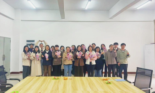 当男教职工们手捧着学校工会给女教职工准备的精美花束并送上节日祝福时,现场氛围达到高潮。从男教职工手里接过花束,大家脸上绽放出幸福的笑容。这一刻,整个会议室充满了爱与温暖,定格成一幅美好的画面。