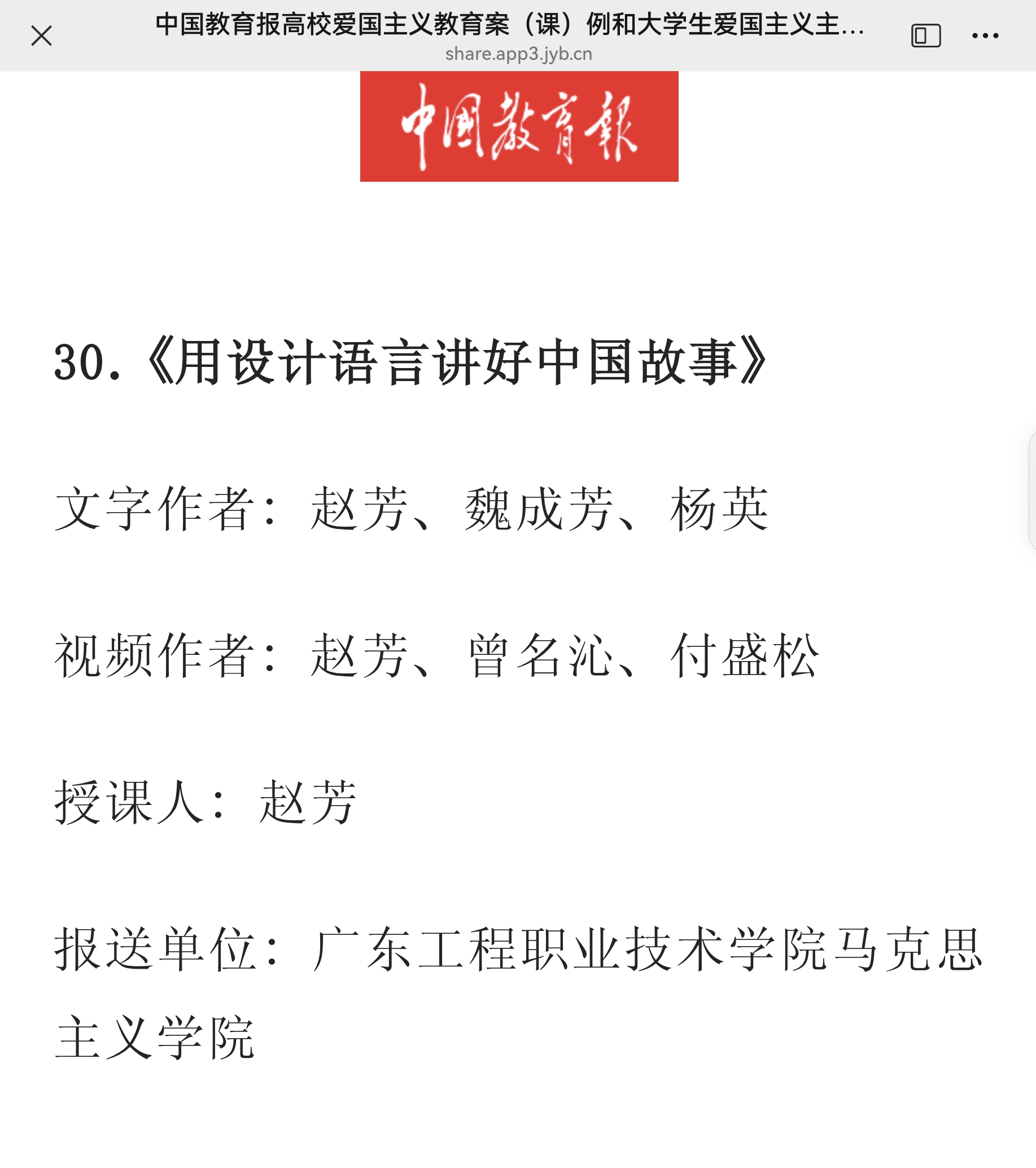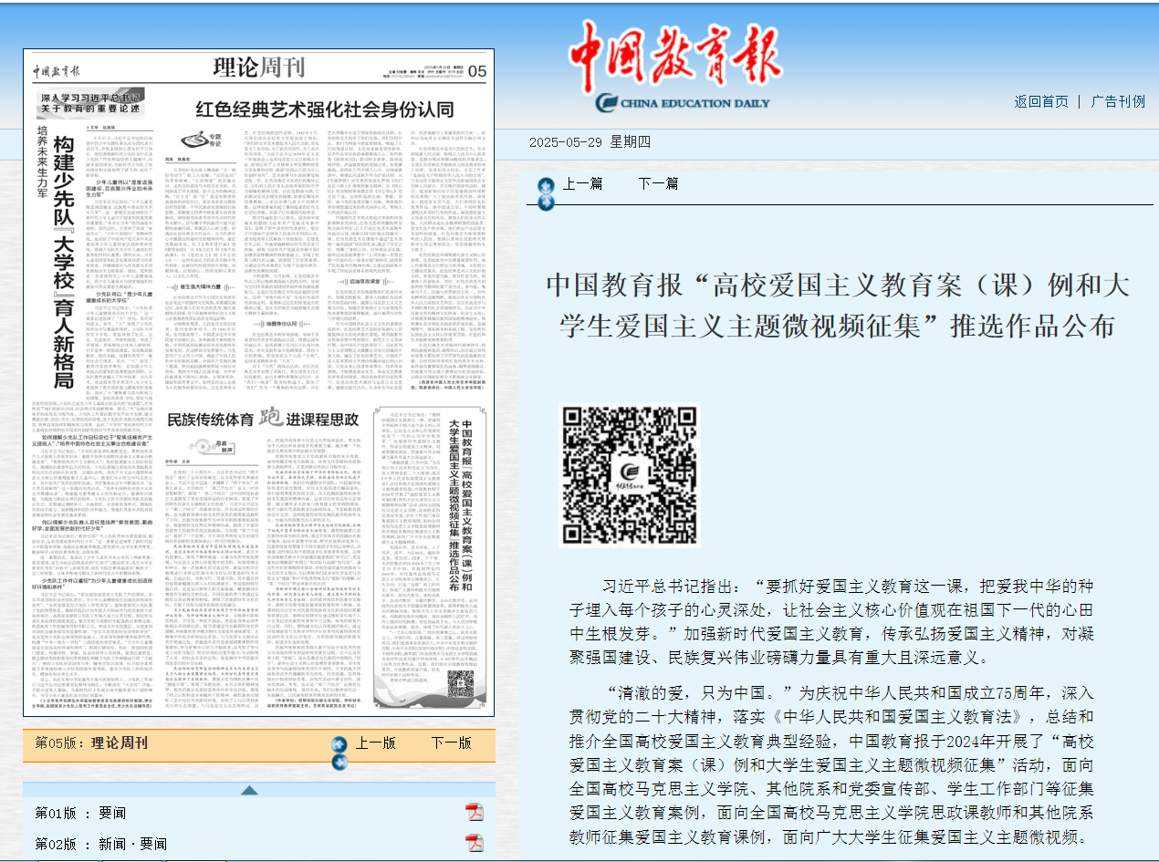 2025年5月29日,中国教育报公布了“高校爱国主义教育案(课)例和大学生爱国主义主题微视频征集”活动的推选作品名单,我校马克思主义学院赵芳、魏成芳、杨英、曾名沁、付盛松等教师提交的课例《用设计语言讲好中国故事》成功入选“高校爱国主义教育课例”。