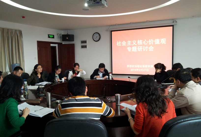 为认真贯彻执行中共中央办公厅《关于培育和践行社会主义核心价值观的意见》精神,提高思政课教师对社会主义核心价值观的认识,使社会主义核心价值观真正进教材、进课堂、进头脑。2014年2月27日下午,思政部在行政楼506会议室召开了社会主义核心价值观专题研讨学习会,思政部全体专兼职教师参加了会议。学院教学质量监控处陈玲玲处长和黄本新副教授莅临会场并参与了研讨。会议围绕社会主义核心价值观的理论发展、科学内涵、实践意义及如何将社会主义核心价值观融入到思想政治理论课教学和实践等主题展开了研讨,大家畅所欲言,气氛热烈。