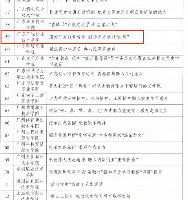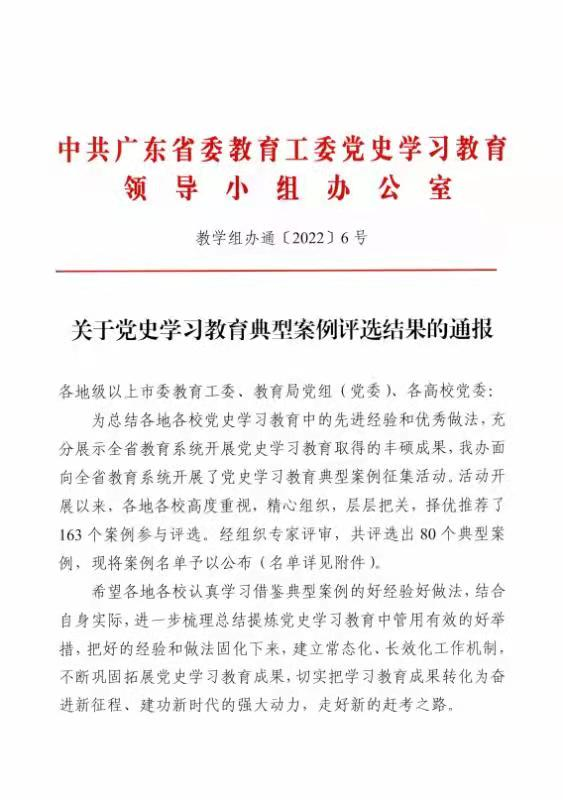 近日,中共广东省委教育工委党史学习教育领导小组办公室公布了广东省教育系统党史学习教育典型案例评审结果。我校马克思主义学院党总支提交的党史学习案例:《用好广东红色资源 打造党史学习“红课”》被评为典型案例。