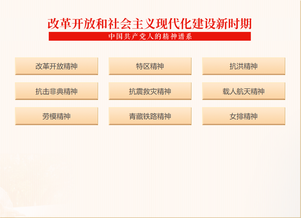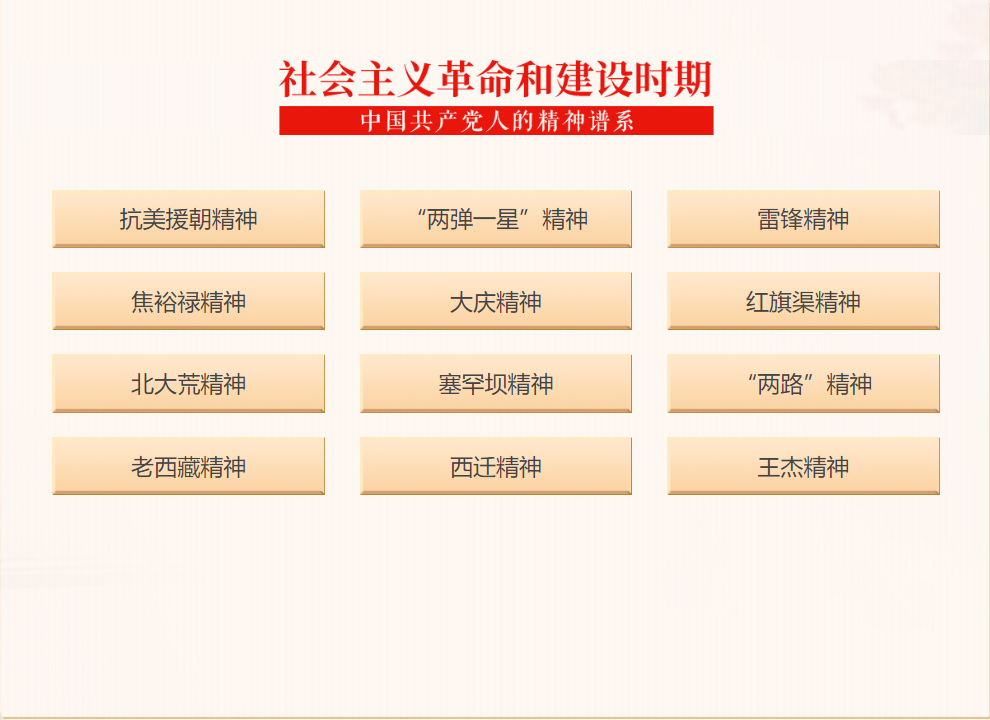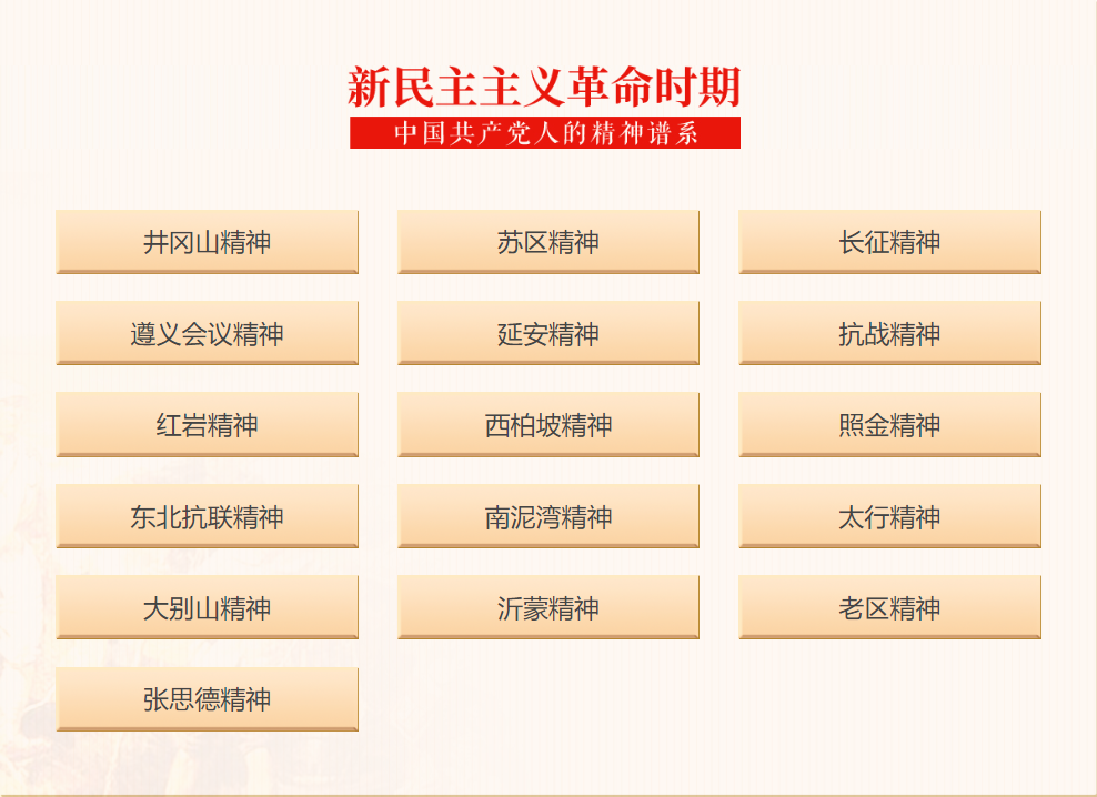 坚定不移、矢志不渝的革命理想信念;不怕牺牲、勇往直前的革命英雄主义精神;自力更生、艰苦奋斗的实干精神;勇于实践、勇于开拓的创新精神;依靠群众、忠诚为民,全心全意为人民谋利益的奉献精神。
