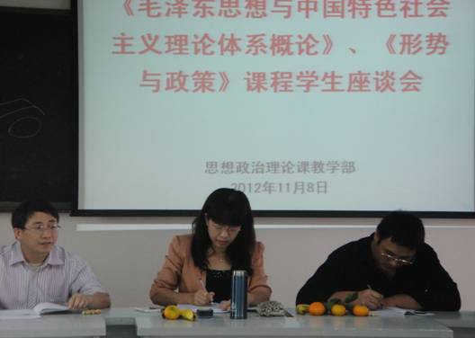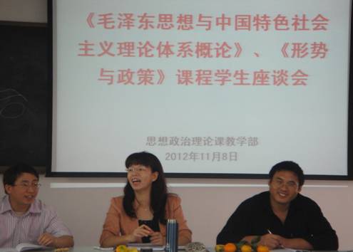 11月8日中午,沐浴着喜迎十八大召开的欢庆喜气,思想政治理论课教学部在教1002和教305,分别召开了2012—2013年第一学期的《毛泽东思想与中国特色社会主义概论》、《形势与政策》和《大学生思想道德修养与法律基础》课程学生座谈会。