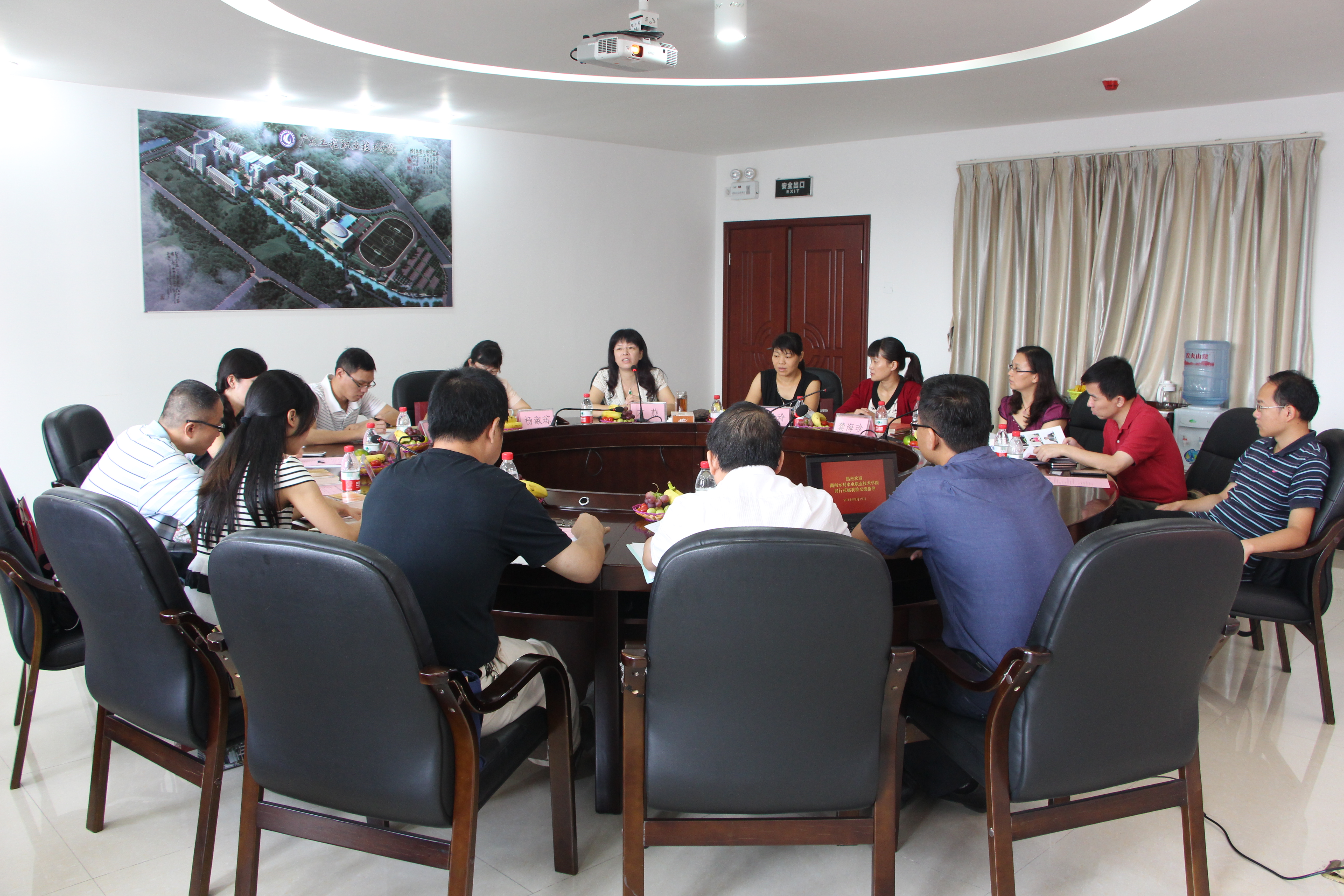 2014年9月19上午,湖南水利电力职业技术学院管理系主任杨淑琼、思政部刘河元主任一行6人来到我院,开展思想政治理论课建设情况交流。