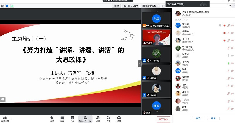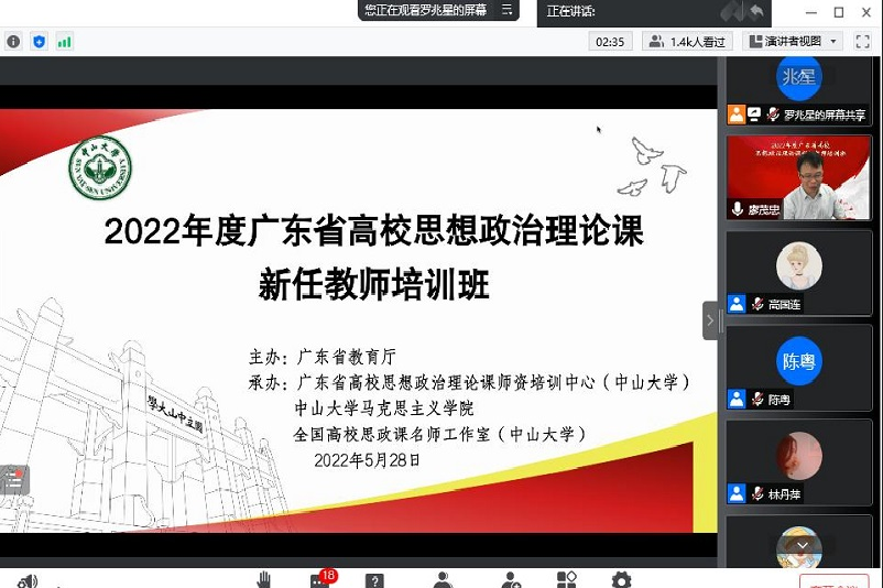 习近平总书记在中国人民大学考察时强调,“思想政治理论课能否在立德树人中发挥应有作用,关键看重视不重视、适应不适应、做得好不好,思政课的本质是讲道理,要注重方式方法,把道理讲深、讲透、讲活,老师要用心教,学生要用心悟,达到沟通心灵、启智润心、激扬斗志。”为贯彻落实习近平总书记重要指示精神,培养我校思想政治理论课新任教师的教学科研综合素养,2022年5月28日,马克思主义学院7位新任教师参加了省教育厅以腾讯会议方式举办的2022年度广东省高校思想政治理论课新任教师培训班。来自省内135所高校,1400多位教师参加了培训,创下了历来培训人数新高。我校7位培训教师圆满完成了培训任务,并顺利获得培训证书。