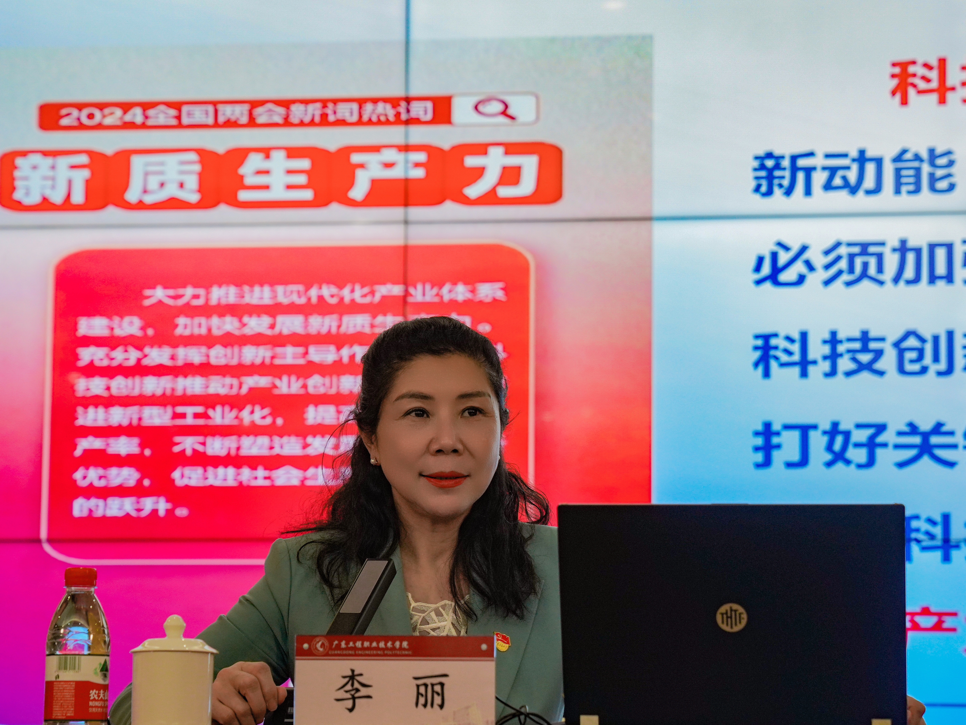 为学习贯彻习近平总书记在全国“两会”期间的重要讲话和全国“两会”精神,引导学生全面把握当前国际创新格局的新形势,深刻认识我国科技创新的机遇和挑战,在科技创新中展现青年担当,2024年3月19、21日,我校党委副书记、校长李丽教授以“走好科技自立自强之路 推进中国式现代化建设”为主题,分别在省职教城校区办公楼报告厅、广州校区图书馆报告厅讲授了“思政第一课”。本次课程由马克思主义学院副院长柏欣主持,学校宣传部(武装部)负责人、马克思主义学院教师代表以及300多名同学聆听了校长“思政第一课”。