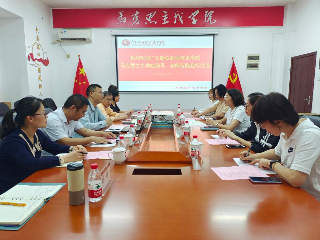 2024年4月26日,广东新安职业技术学院马克思主义学院院长兰茹一行5人来我校马克思主义学院调研交流。交流会在广州校区办公楼215会议室举行。马克思主义学院党委负责人张建德、各教研室主任及教师代表参加了交流座谈,会议由张建德主持。