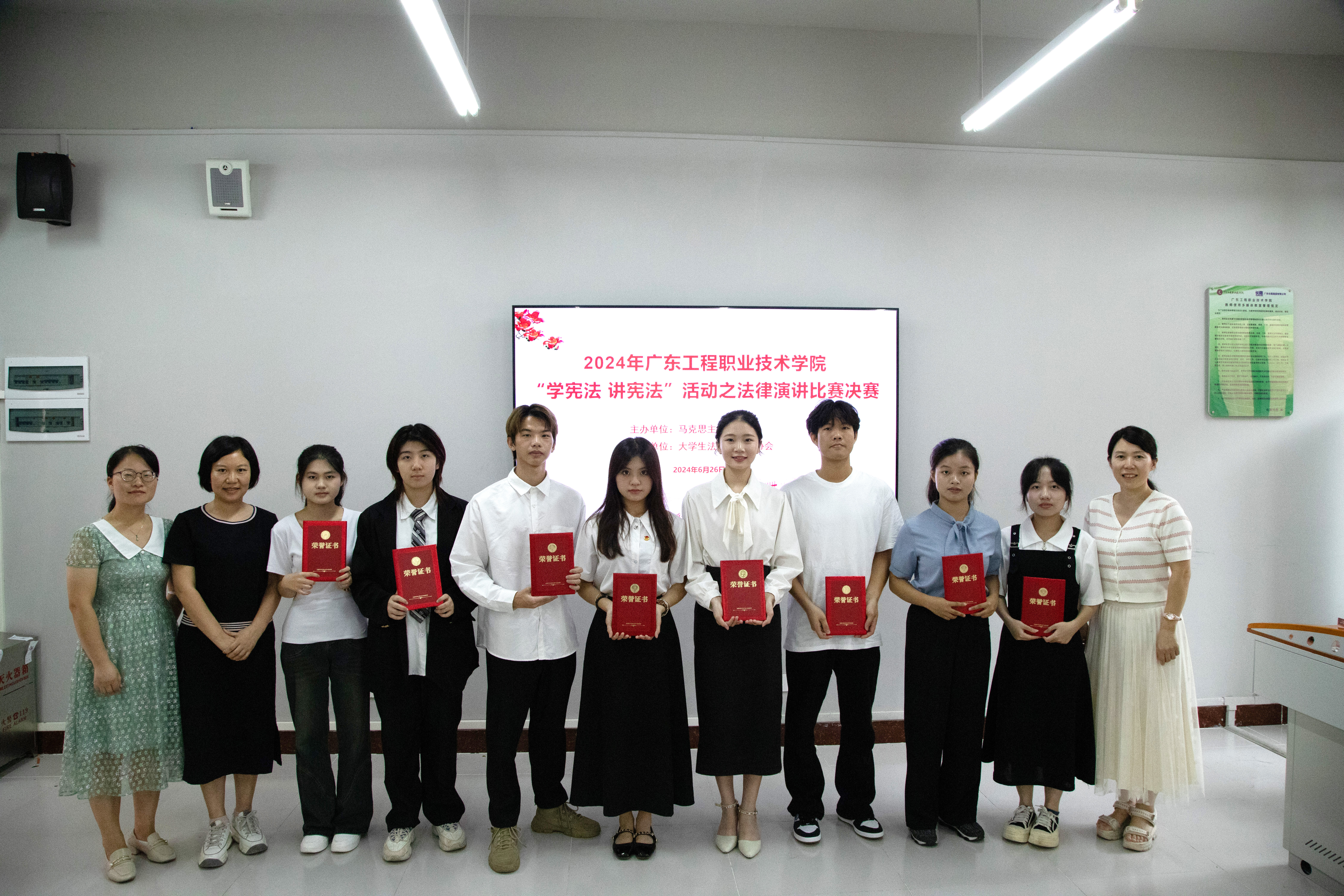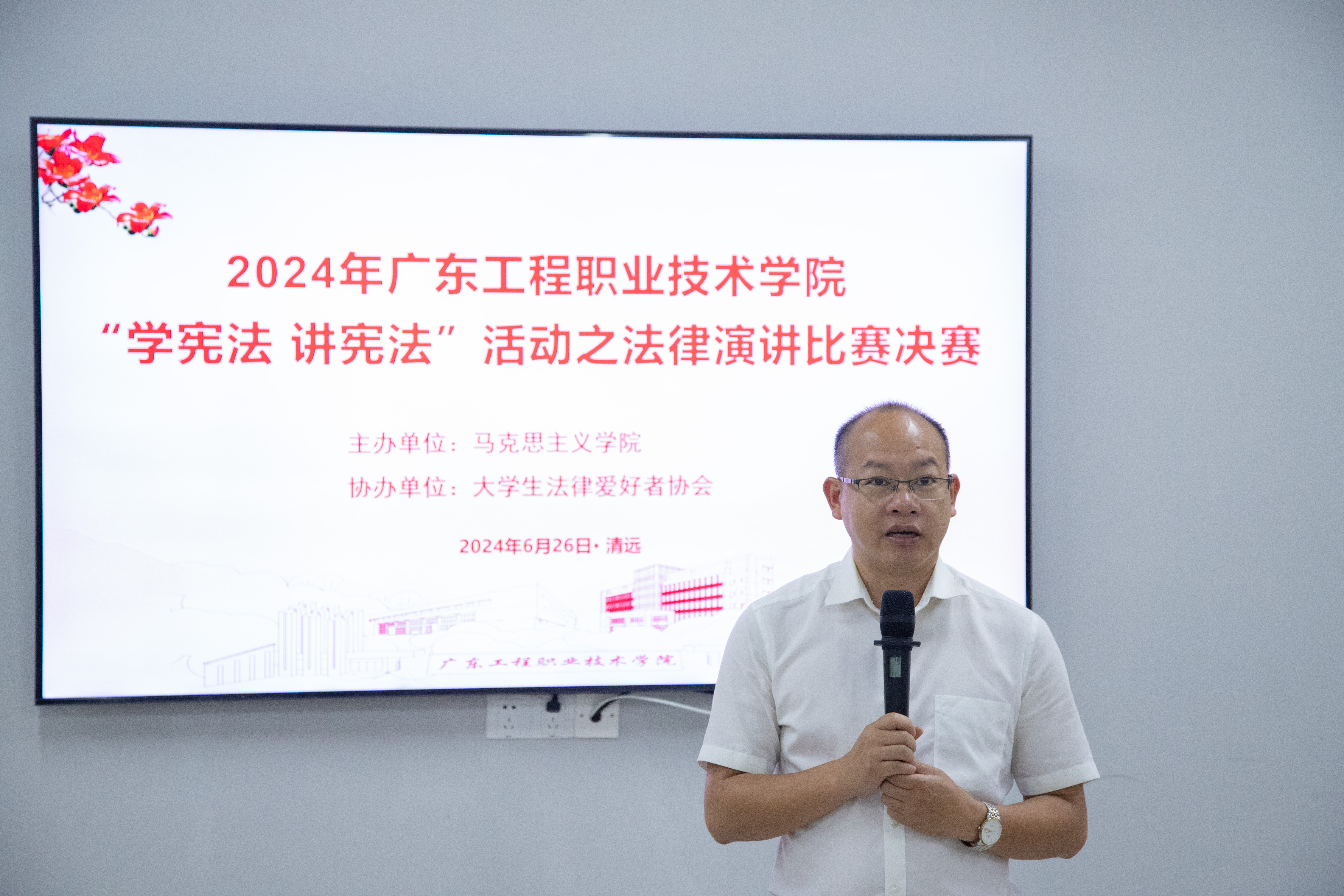 为深入学习宣传习近平法治思想,扎实推动我校大学生宪法宣传教育走深走实,根据《广东省教育厅关于举办第九届广东省学生“学宪法 讲宪法”活动的通知》的精神,我校成功举办了2024年广东工程职业技术学院“学宪法 讲宪法”系列活动,活动包括演讲比赛与法治素养知识竞赛。本次活动由我校马克思主义学院主办,校大学生法律爱好者协会协办。