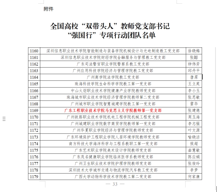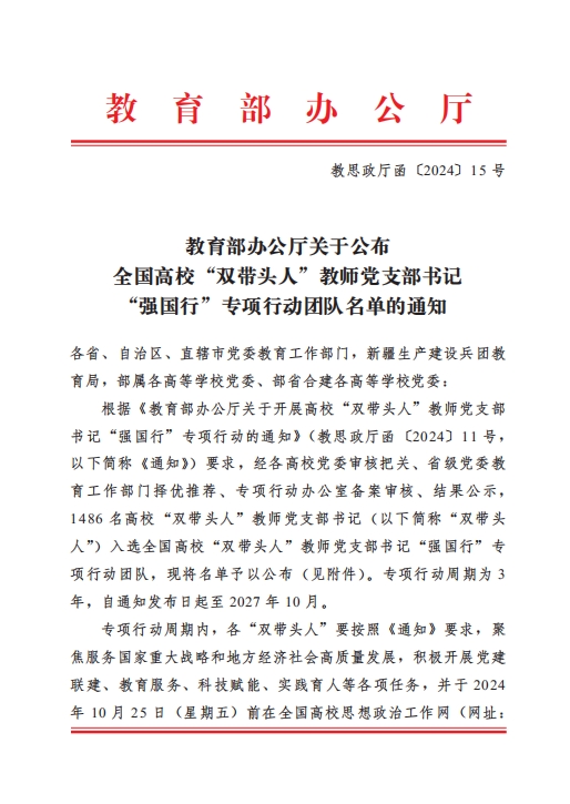 近日,教育部办公厅印发了《关于公布全国高校“双带头人”教师党支部书记“强国行”专项行动团队名单的通知》,我校马克思主义学院教师第一党支部入选。