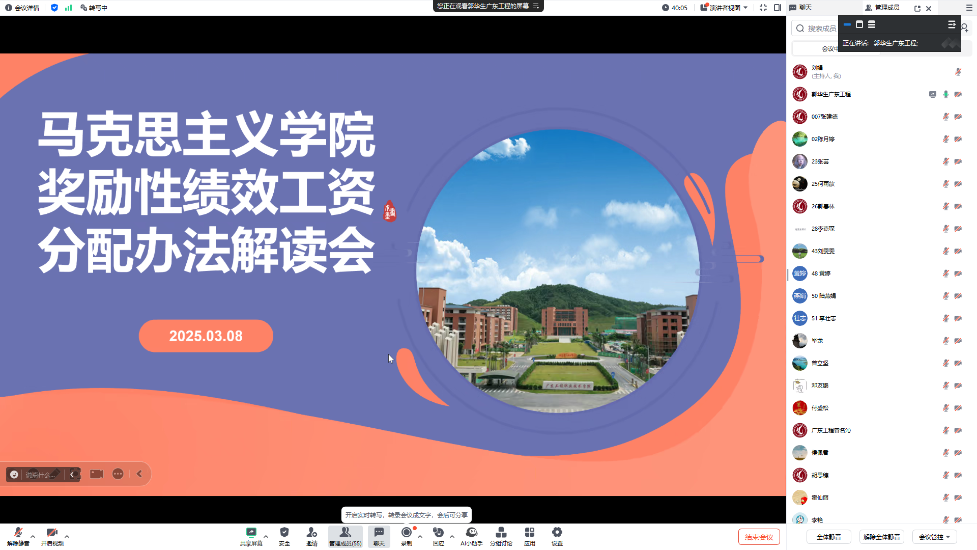 郭华生表示,学院奖励性绩效工资分配办法(草案)贯彻落实了学校关于高质量发展的工作要求,有利于强化学院全体教职工的主人翁意识和责任感、使命感,更充分地调动全体教职工教书育人工作积极性和创造性,有力支撑教职工个体职业发展,持续增强学院事业发展的朝气和活力,促进马克思主义学院的内涵建设质量和效益的全面提升。