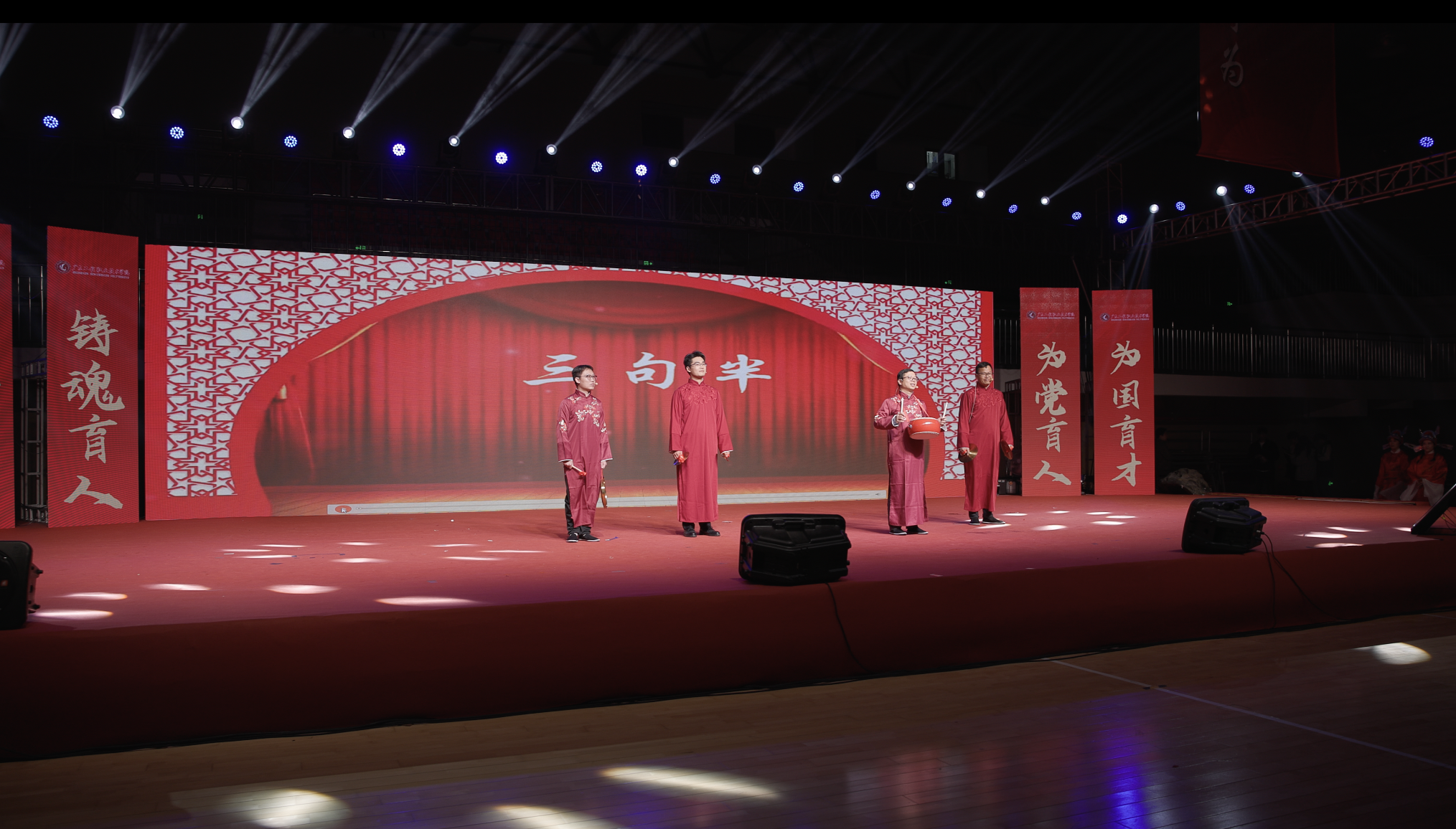 为了让理论宣传既有高度又接地气,推进马克思主义中国化时代化大众化,四名教师手持锣鼓镲表演“三句半”。表演者从“理论筑基育新人”“实践创新探新路”“铸魂育人谱新篇”三方面,用通俗幽默又饱含深意的语言,生动讲述了马克思主义学院在学科建设、教学改革、理论创新、服务社会等方面的探索与成就,展现了思政课教师守正创新的教学智慧,更通过传统曲艺与时代主题的巧妙融合,获得热烈反响。