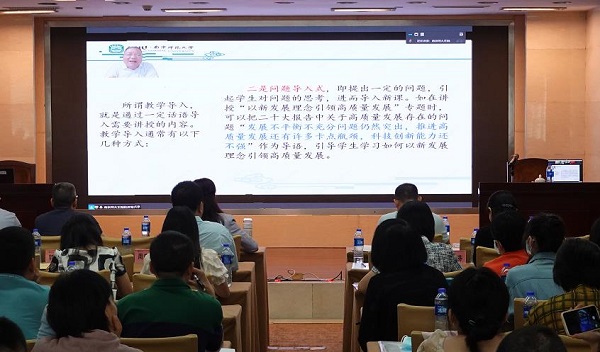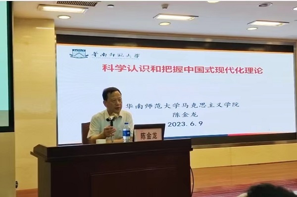 在专家辅导报告环节上,教育部“长江学者”特聘教授、华南师范大学马克思主义学院院长、博士生导师陈金龙教授站在大历史观的高度,以习近平总书记的系列重要讲话和党的二十大精神为指引,从“为什么要建构中国式现代化理论”“中国式现代化理论的基本内容”“中国式现代化理论蕴含的世界观和方法论”“中国式现代化理论的特征”“中国式现代化理论建构的意义”“广东高质量发展与现代化的广东路径”等六个方面,对如何科学认识和把握中国式现代化理论进行了系统阐释。陈金龙教授的报告高屋建瓴,学理清晰,视角独到,见解深远,既有学术旨趣,又有现实关切,对参会教师全面、准确和深刻理解“中国式现代化”以及拓宽教学和研究视野具有重要的指导意义。