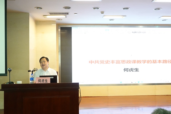 中国人民大学马克思主义学院二级教授、博士生导师,中共党史党建研究院副院长何虎生围绕“中国特色社会主义进入新时代”“确立党中央和全党的核心的决定性意义”“阐明思想产生发展完善的历史事件和标志性事件”“伟大建党精神和赓续发展”四方面内容,史论结合,深入阐述了“中共党史丰富思政课教学的基本路径”。何虎生教授的报告,思维开阔,逻辑清晰,纵横捭阖、旁征博引,颇具思想性、学术性和指导性,对进一步引导“概论”课教师掌握党史理论、拓宽教学视野、激发研究热情具有积极的促进作用。