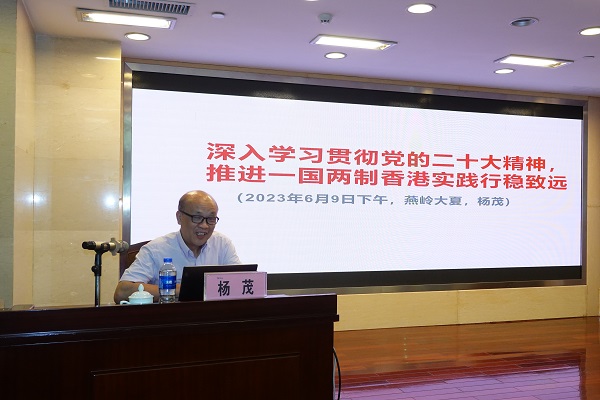中央政府驻港联络办社会工作部原部长、广东港澳经济研究会高级特约研究员杨茂作了《深入学习贯彻党的二十大精神,推进“一国两制”香港实践行稳致远》的主题报告。杨茂研究员全面阐述了党的二十大报告中关于“坚持和完善‘一国两制’,推进祖国统一”论述,通过生动的语言和真实的案例,梳理了香港回归后的诸多大事件,以全景式的方式呈现了香港实施“一国两制”的历史、现实及未来展望。