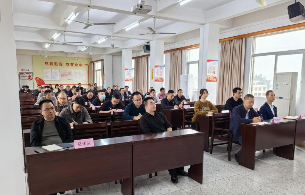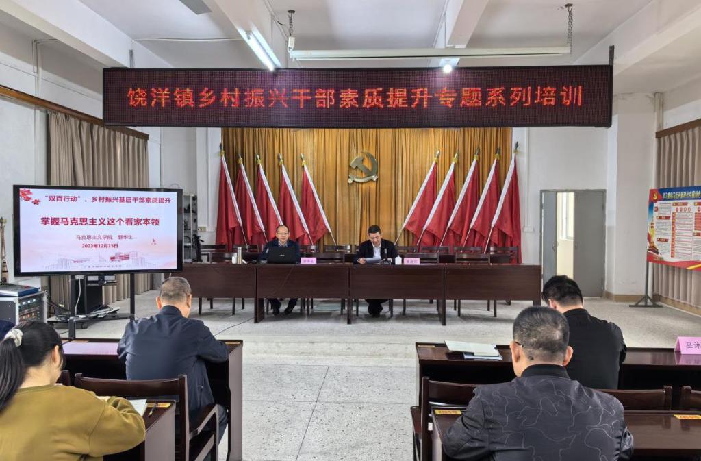 为全面落实“双百行动”持续推进乡村振兴,根据工作部署,12 月 15 日上午,我校组织举办的饶洋镇基层干部素质提升主题培训在人民政府五楼会议室举行。培训活动由饶洋镇党委书记赖建国主持,学校马克思主义学院院长郭华生、曾立坚老师分别进行授课,饶洋镇相关党政领导干部、各村业务骨干以及驻镇帮扶工作队等 40 多人参加了此次培训。