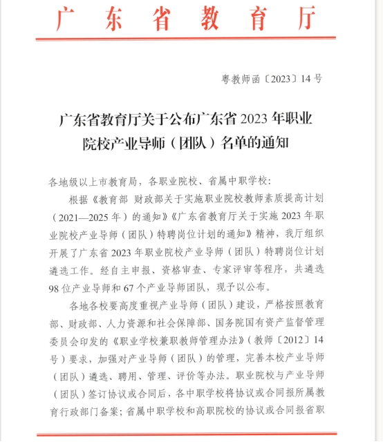 根据《广东省教育厅关于公布广东省2023年职业院校产业导师(团队)名单的通知》(粤教师函〔2023〕14号),在广东省教育厅组织的2023年职业院校产业导师(团队)特聘岗位计划的申报中,我校软件技术专业产业导师龚霖迪、建筑室内设计专业产业导师罗威被遴选为广东省2023年职业院校产业导师。