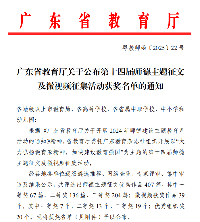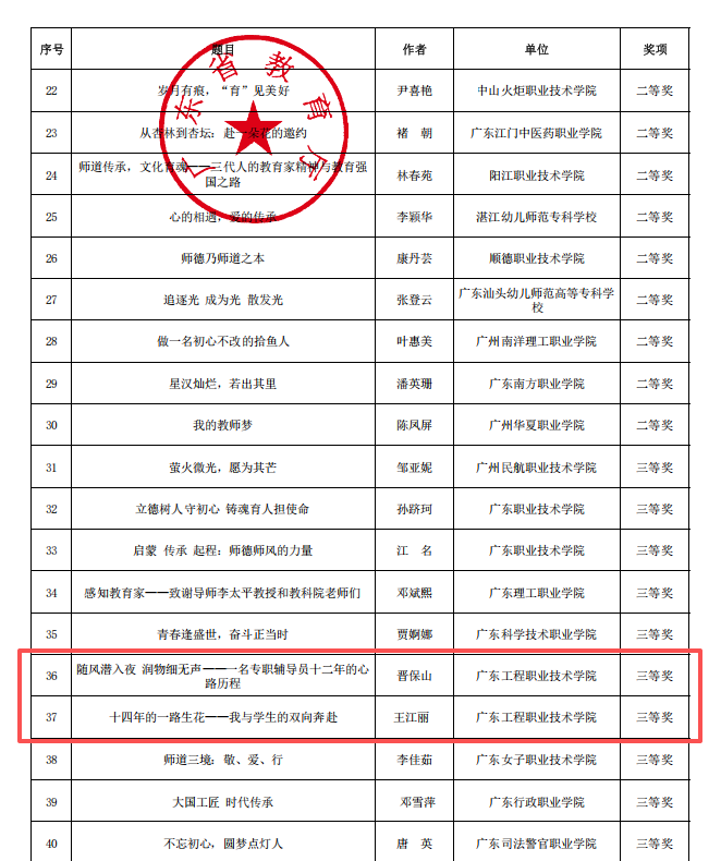 近日,广东省第十四届师德主题征文及微视频征集活动获奖名单公布。我校晋保山老师的作品《随风潜入夜 润物细无声——一名专职辅导员十二年的心路历程》、王江丽老师的作品《十四年的一路生花——我与学生的双向奔赴》在主题师德征文活动中获得高职高专组三等奖。