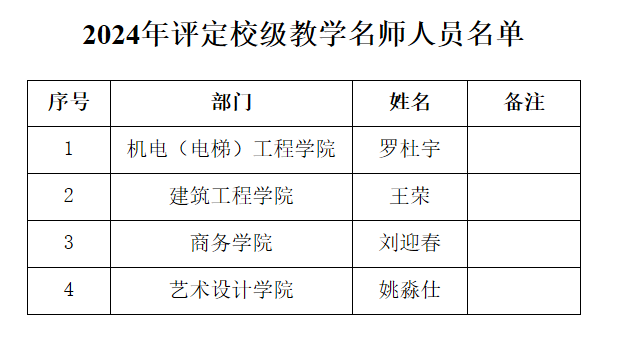 根据《广东工程职业技术学院教学名师及名师工作室评选与管理办法》(2024年修订)(粤工程职院发〔2024〕27号)及《关于开展2024年骨干教师、校级教学名师评选及校级高层次技能型兼职教师认定工作的通知》要求,经个人申请、二级学院(部)审核推荐、相关职能部门审核、专家评审、征求纪检室拟评定人员廉政意见、公示无异议、校长办公会审议、校党委会审定等程序,学校评定机电(电梯)工程学院罗杜宇等4人(名单见附件)为校级教学名师,并纳入“凤凰名师人才库”。
