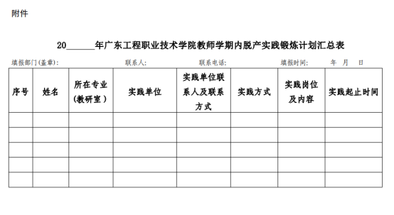 根据管理办法精神,各二级学院(部)需每年制定本部门教师实践锻炼计划,并于每年 12 月底将本年度《广东工程职业技术学院教师实践锻炼完成情况汇总表》和下年度《广东工程职业技术学院教师学期内脱产实践锻炼计划汇总表》报人事部门审核,现请各二级学院(部)根据专业建设、课程建设及教师培养的需要,采用二级学院(部)安排与教师自行申请相结合的方法,制定 2024 年度教师实践锻炼计划,并于 2024 年 4 月 30 日前,将 2024 年《广东工程职业技术学院教师学期内脱产实践锻炼计划汇总表》(可编辑 WORD 版、签字盖章 PDF 版)通过 OA 发人力资源部汇总,并组织参加实践锻炼的老师按照管理办法要求规范完成申报手续及各项实践任务。