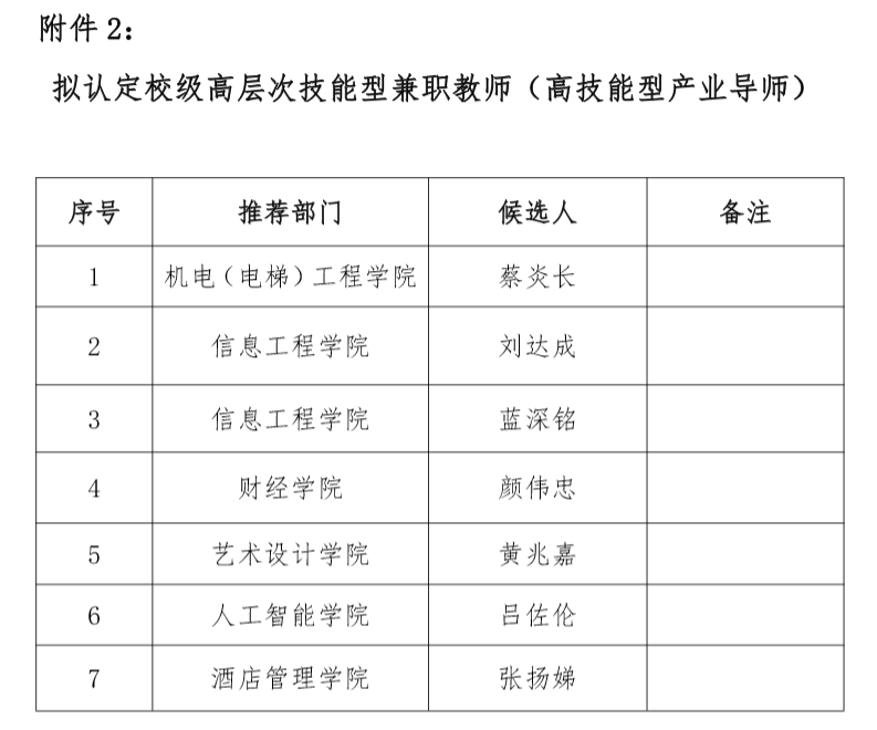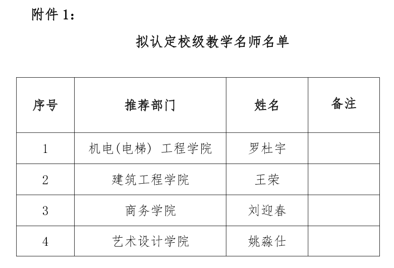 经个人申请、二级学院(部)审核推荐、相关职能部门审核、校内外专家评审,拟评定机电(电梯)工程学院罗杜宇等 4 人(名单见附件 1)为校级教学名师;认定信息工程学院刘达成等 7 位兼职教师(名单见附件 2)为校级高层次技能型兼职教师(高技能型产业导师)。现将上述结果予以公示,公示时间为 2024 年 5 月 15 日-2024 年 5 月 21 日。若对结果有异议,请以书面形式反映。反映情况要提供具体事实和政策依据,以个人名义反映的要求签署本人真实姓名,以单位名义反映的须单位负责人签名并加盖公章;不提供具体事实材料,不签署真实姓名的,一律不予受理。