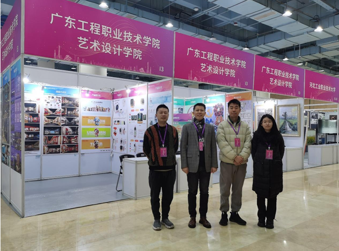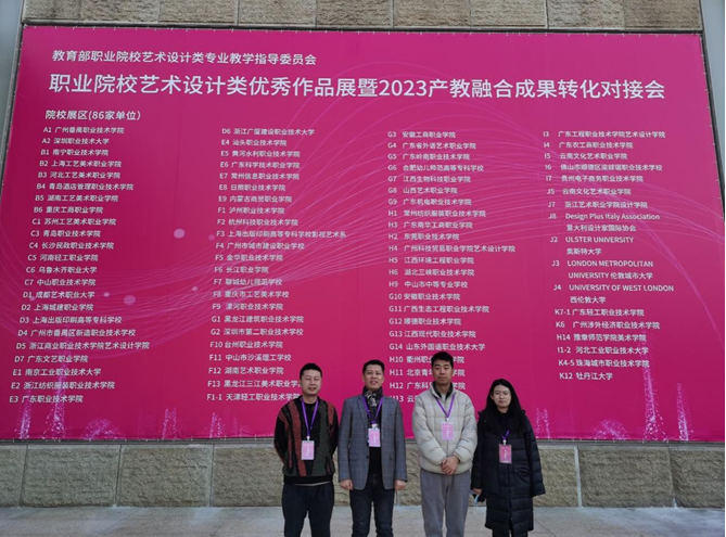 艺术设计学院在 12 月 23-25 日参加了由教育部艺术设计类专业教学指导委员会主办《职业院校艺术设计类优秀作品展暨 2023 年产教融合成果转化对接会》,本次展会在广州琶洲灵感创新馆2楼L3展区举行,艺术设计学院施焦副院长带领李夏东、刘一星、李瑛三位专任老师一起参加了此次展会。