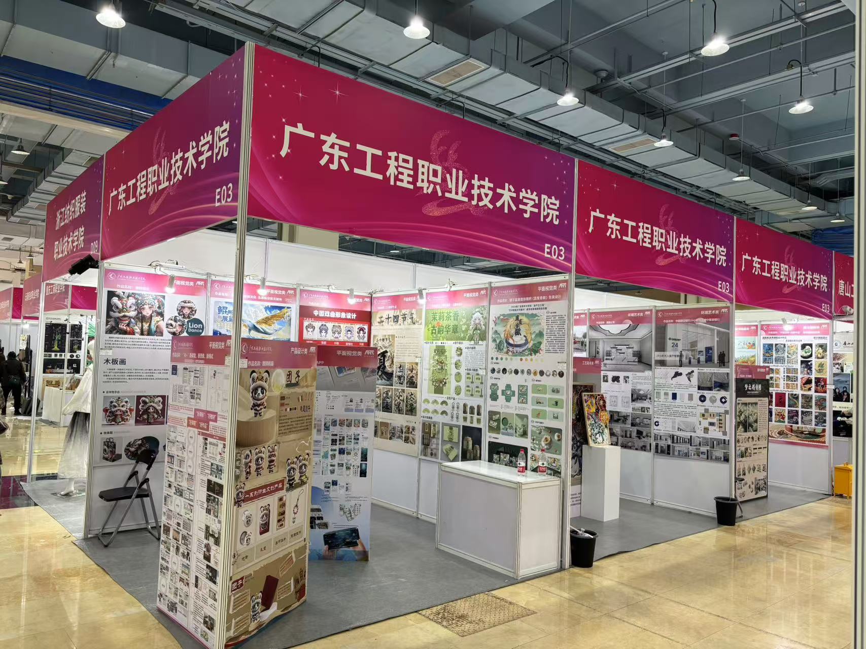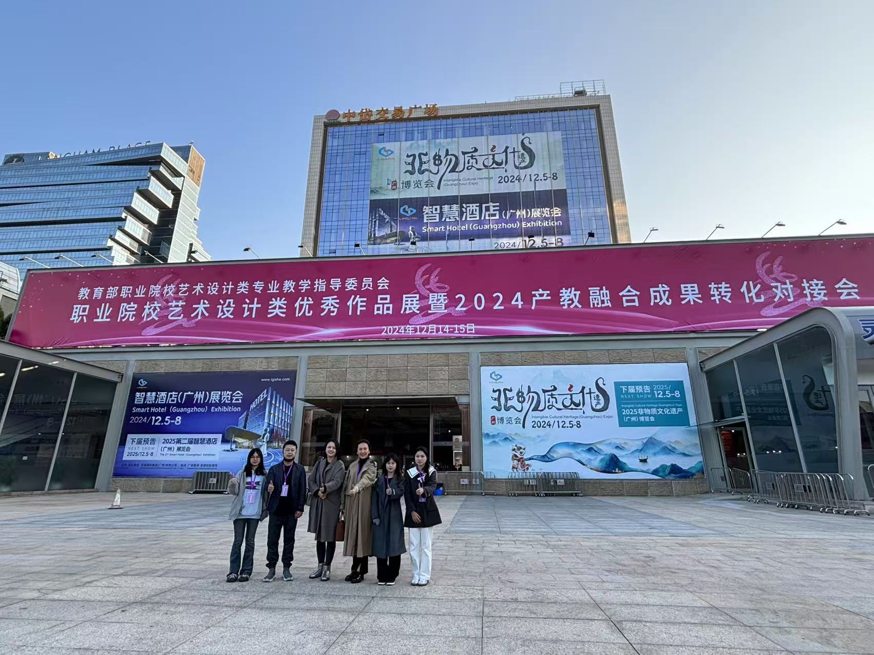 艺术设计学院在 12 月 13-15 日参加了由教育部艺术设计类专业教学指导委员会主办《职业院校艺术设计类优秀作品展暨 2024年产教融合成果转化对接会》,本次展会在广州琶洲灵感创新馆2楼L3展区举行,艺术设计学院视觉传达专任主任宋萱带领徐谌榕、刘一星两位专任老师一起参加了此次展会。