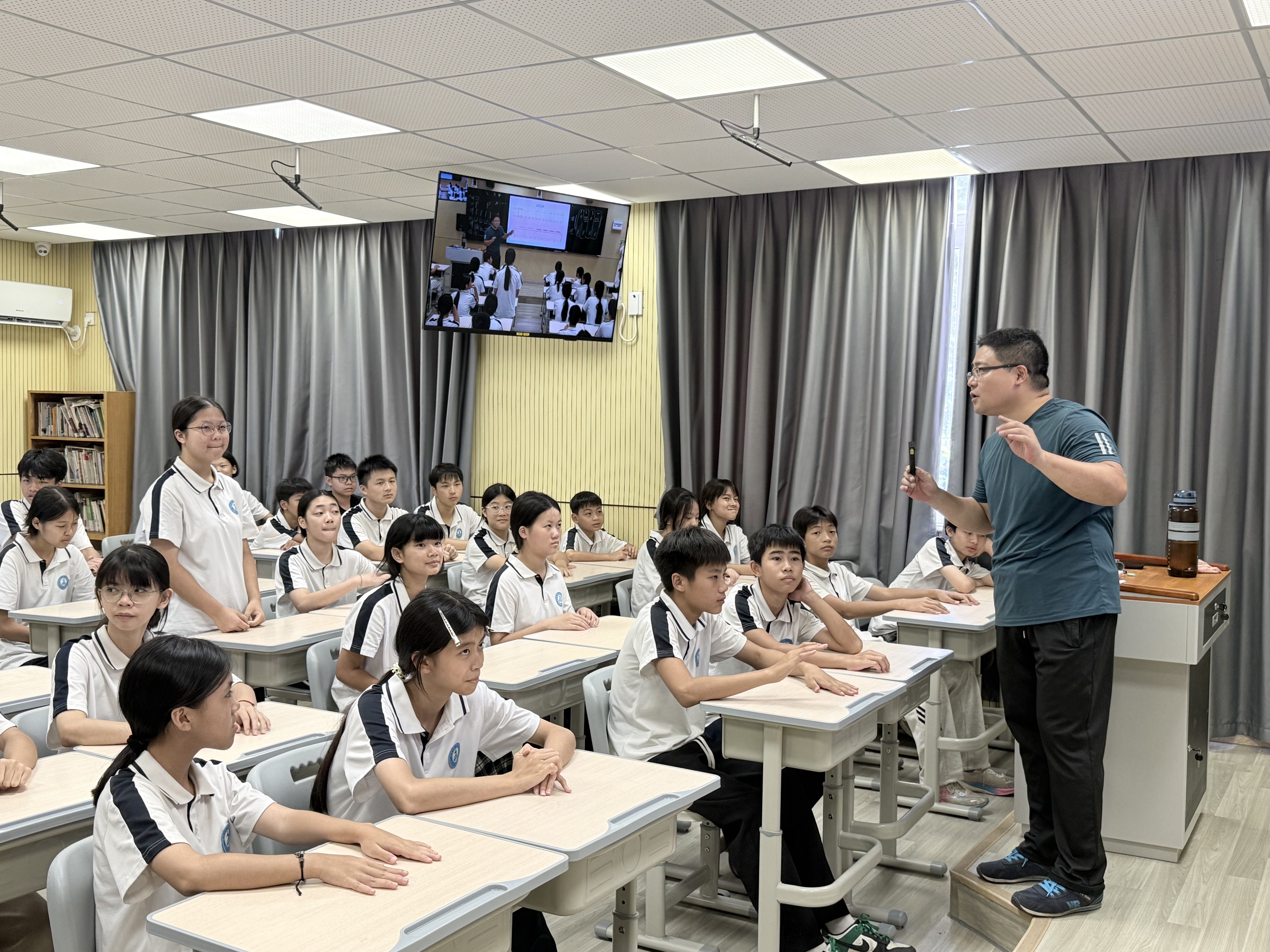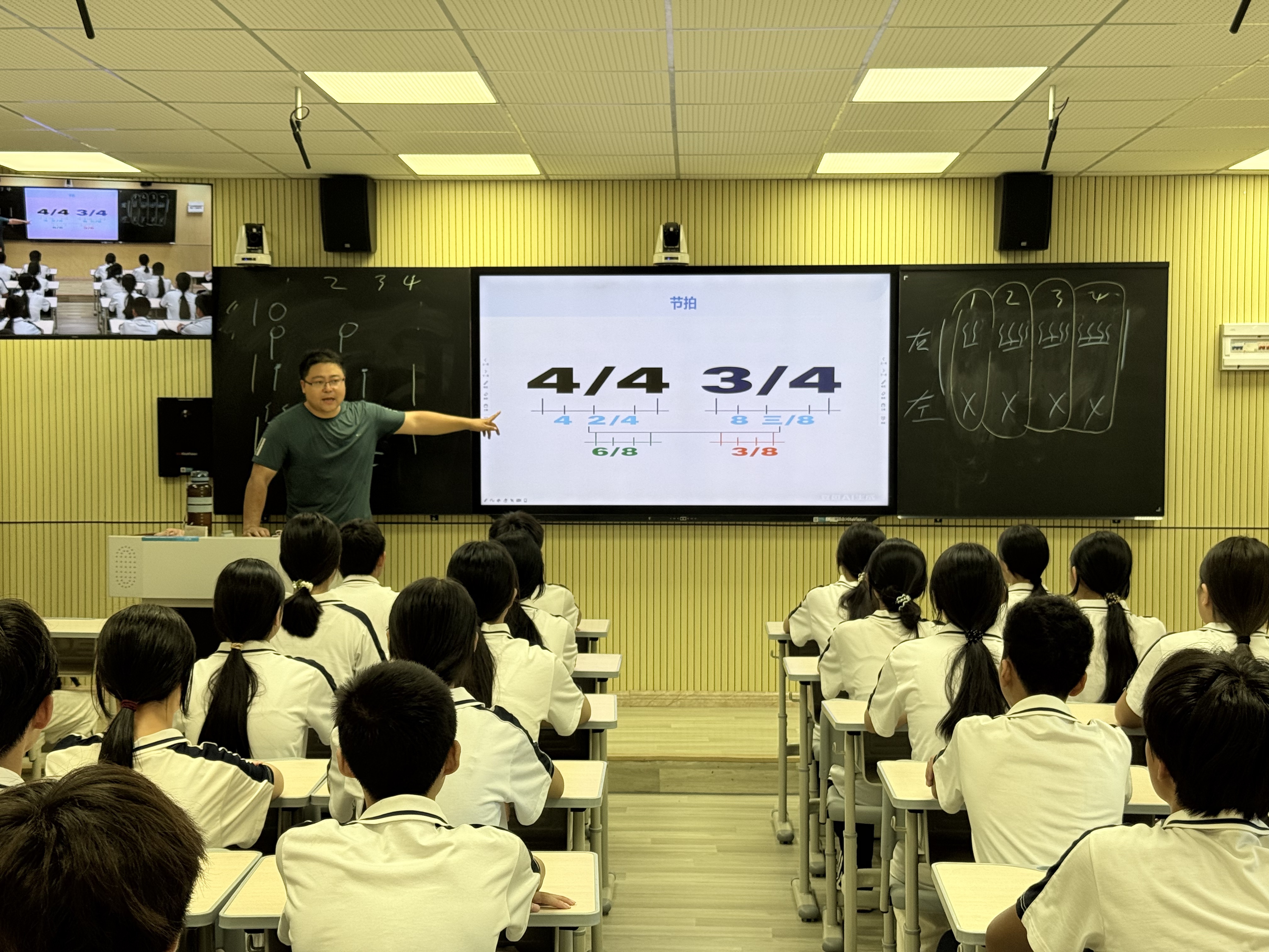 针对初中阶段学生的特点,浸潭镇第二初级中学的美育课堂以“趣味互动+素养提升”为方向,让艺术浸润更具吸引力。闫亮老师带来的节奏游戏课程一开课便点燃了八年级学生的热情:一段动感音乐热场后,从基础节拍划分到复杂节奏型组合,从热闹的节奏接龙到专注的合唱声部练习,孩子们在“玩中学、学中悟”,不仅掌握了基本的音乐节奏知识,更唤醒了内在的律动潜能。课堂上,原本沉默的学生主动参与节奏互动,原本五音不全的孩子勇敢跟着哼唱,艺术的感染力让校园焕发新的活力。