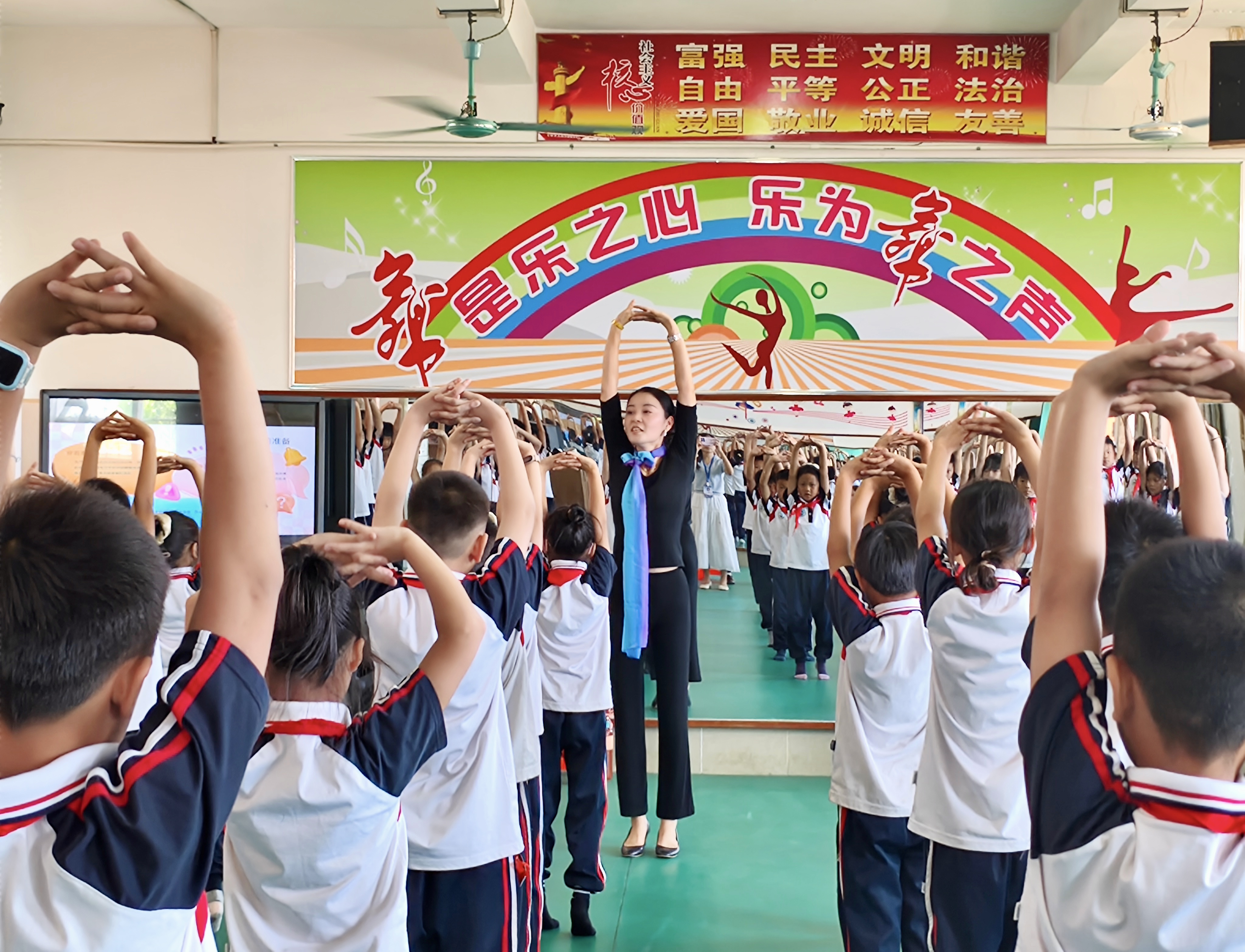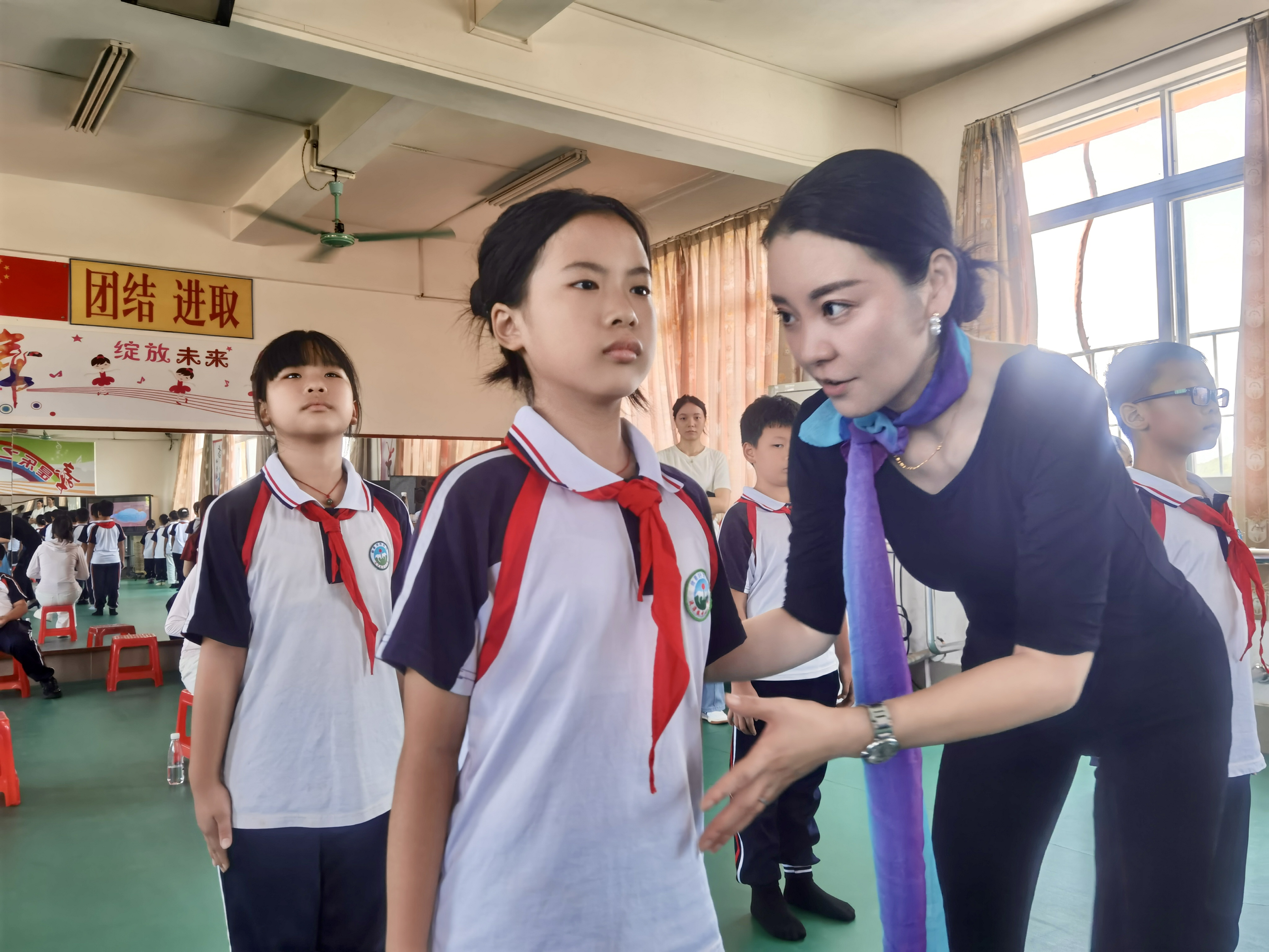 作为此次帮扶的重点学校之一,浸潭镇中心小学的校园里处处涌动着美育浸润的热潮。形体课堂上,李丹老师以“体态塑形+审美启蒙”为核心,从基础的站姿、坐姿矫正教起,通过镜面示范、分组练习等方式,引导孩子们感知身体线条之美。原本略显拘谨的孩子在一对一指导中逐渐放松,挺拔的身姿与自信的笑容成为课堂上最动人的风景。