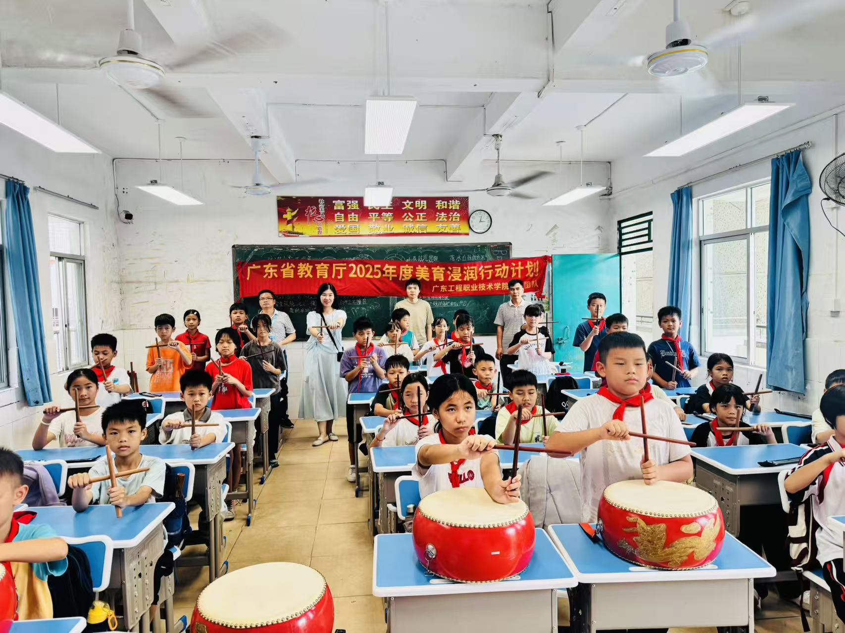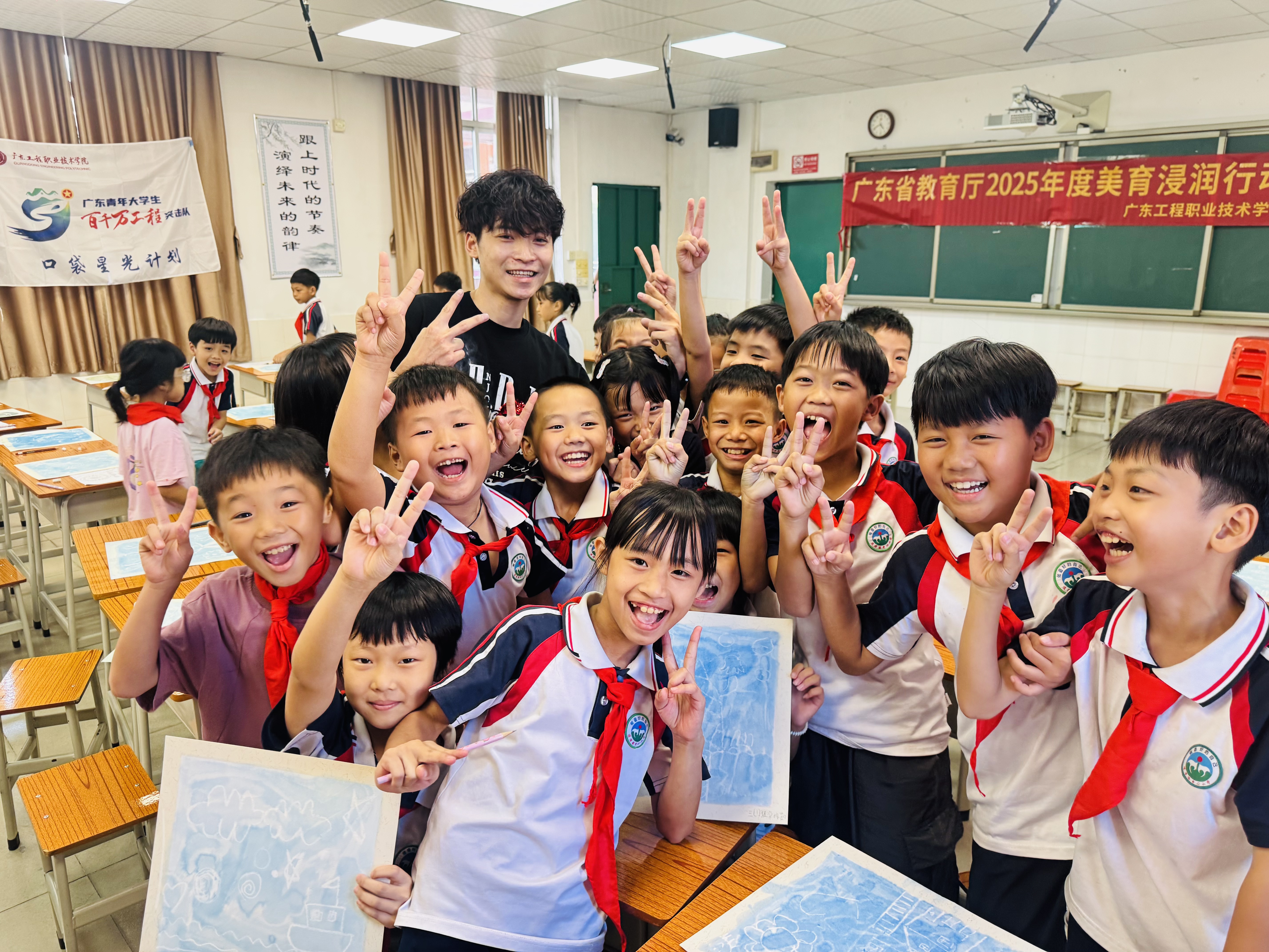 从浸潭镇中心小学的多元课程到红星希望小学的文化传承,从初中的节奏启蒙到各校的师资赋能,广东工程职业技术学院美育教师团队的美育浸润精准对接每所学校的需求。课堂上的专注眼神、作品完成后的灿烂笑容、校领导期待合作的恳切话语,都印证着美育浸润已在浸潭镇的乡村校园里落地生根。未来,随着“高校+乡村学校”协同机制的深化,这些学校的美育之路必将越走越宽,让每个孩子都能在艺术滋养中成长。(撰稿:黄洋 温洁芸 核对:郭希 审核:吴文丰)