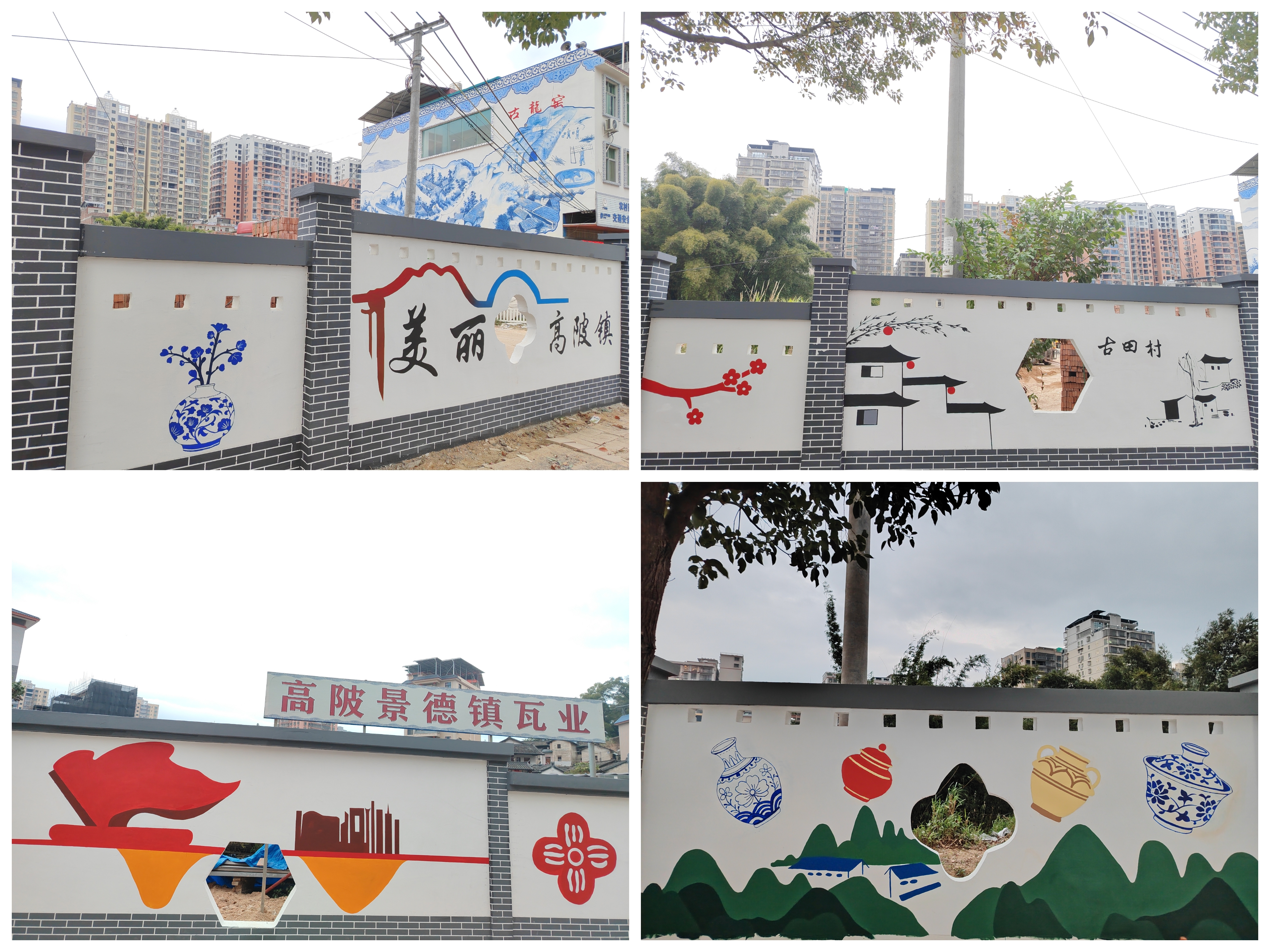 指导教师肖飞、李小能、李婕、赵一丹、曾明镇,辅导员郑晓芬、黄洋、李博文、佘晨星、刘娇全程参与设计与绘制指导。他们认为墙绘不仅是美化乡村环境的手段,更是文化传承与创新的载体。团队在前期调研基础上,将高陂青花瓷的“釉下彩绘”技艺、非遗元素、特色农产品与当代审美相结合,使墙绘作品既彰显地方特色,又富有时代气息,成为推动“陶瓷+文旅”融合发展的视觉纽带。