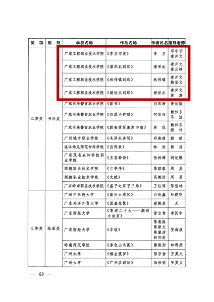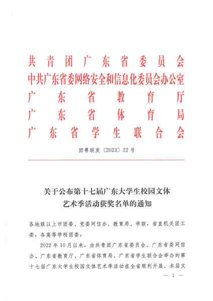 近日,由共青团广东省委员会、广东省委网信办、广东省教育厅、广东省体育局、广东省学生联合会举办的第十七届广东大学生校园文体艺术季活动奖项揭晓。我校艺术设计学院学生作品在众多参赛作品中脱颖而出,荣获二等奖4名,三等奖1名。