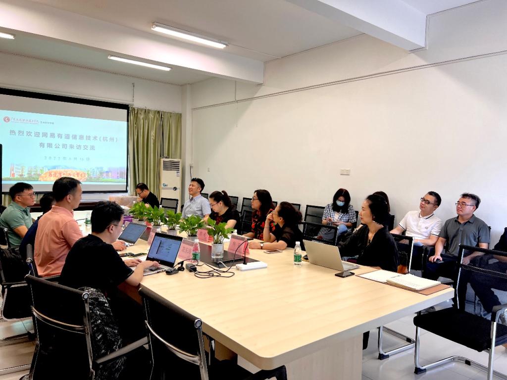 2022年6月16日上午,网易有道信息技术(杭州)有限公司网易有道校企合作负责人宋维衍、数业智能职教副总经理曾国平、数业智能广东业务负责人乔充等一行到访艺术设计学院洽谈校企合作事宜,艺术设计学院院长郭希、党总支副书记焦英、副院长施焦热情接待,参加洽谈会议的还有各专业主任、骨干教师。
