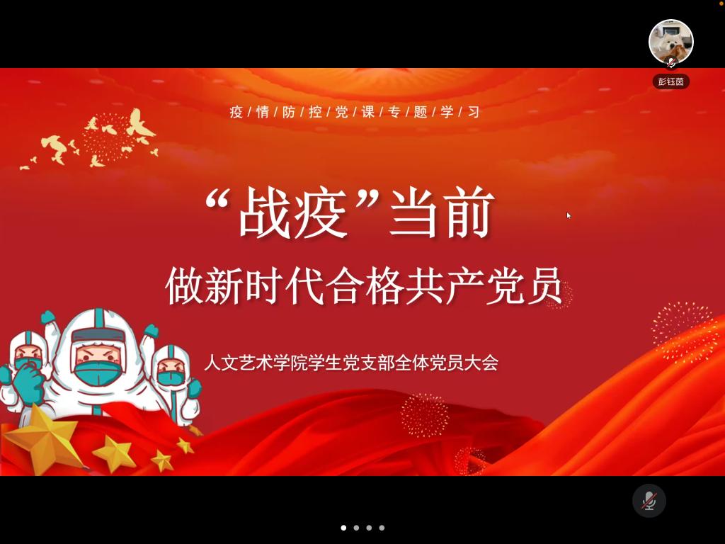 为深入贯彻习近平总书记重要讲话精神,从严从紧从细落实校园疫情防控工作要求,各基层党组织在疫情防控中通过“树党旗”“佩戴党员徽章”引导党员“亮身份、当先锋、作表率”,充分发挥基层党组织战斗堡垒作用和党员先锋模范作用。4月1日晚,人文艺术学院学生党支部以线上形式开展了以《“战役”当前,做一名合格共产党员》为主题的党课,全体党员共同学习,深刻领会。