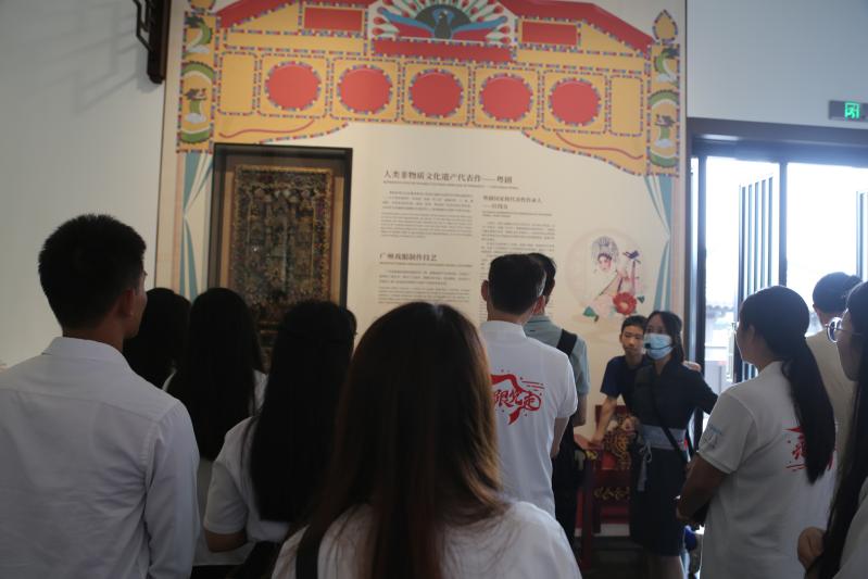 广州市文化馆新馆,是广州市政府投资建设的重要文化基础设施,占地面积约14.2万平方米,是目前全国体量最大的文化馆之一,园区分布有广州公共文化中心、广州文艺中心、岭南翰墨园、客家风韵园等多个园区,集公益演出、培训、展览、创作、研究交流、非遗保护与传承为一体,致力于建设成为国际一流,国内标杆,湾区领跑的文化地标。党员们先后参观园区内的公共文化中心、翰墨园、曲艺园、广府园、广绣园,观赏广绣、广彩、广州牙雕等非遗广作展品,感受岭南古琴、咸水歌、粤曲、粤剧等传统音乐、曲艺、戏剧,了解行花街、扒龙舟、乞巧节、广东醒狮等民俗节庆活动。