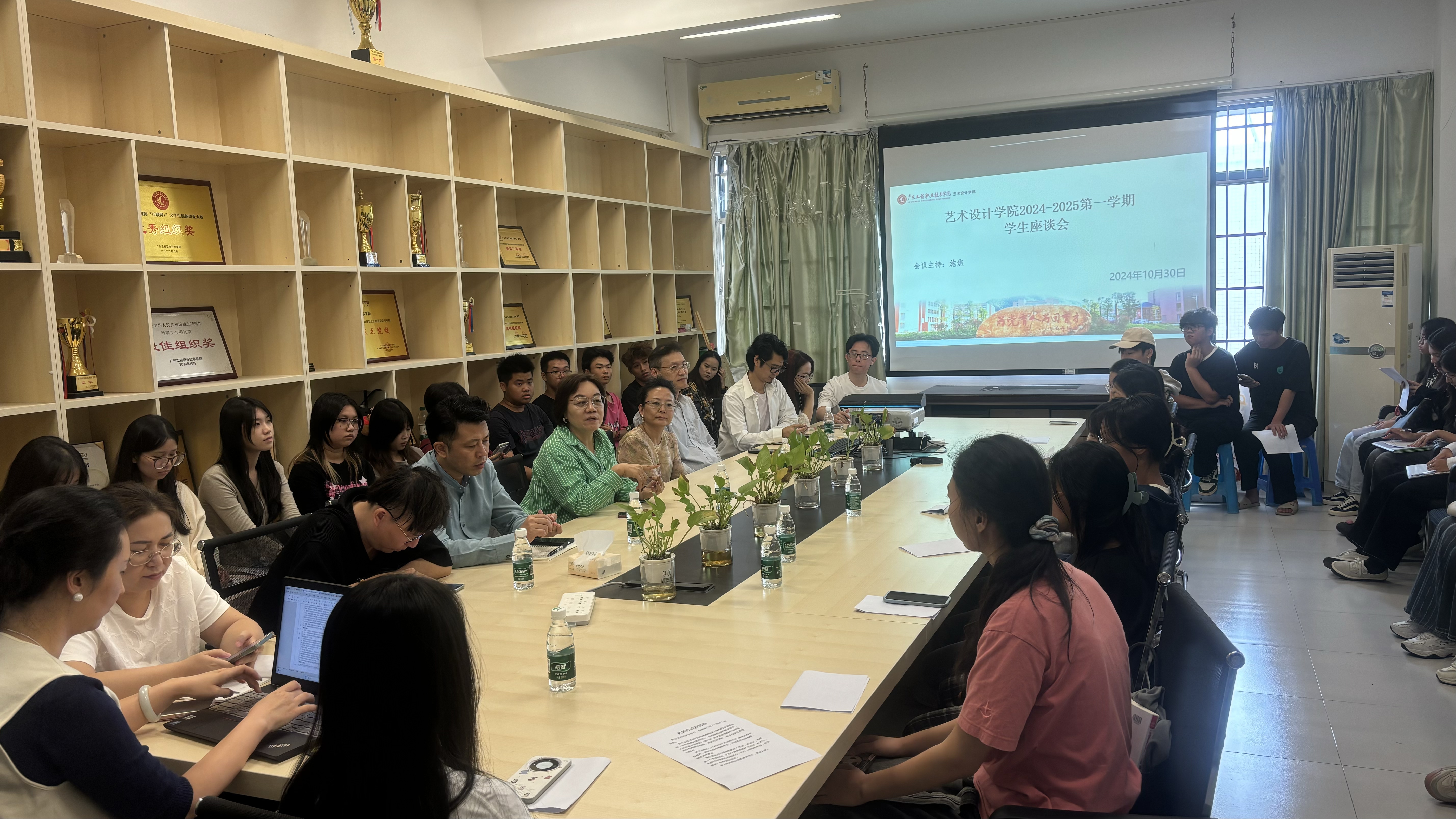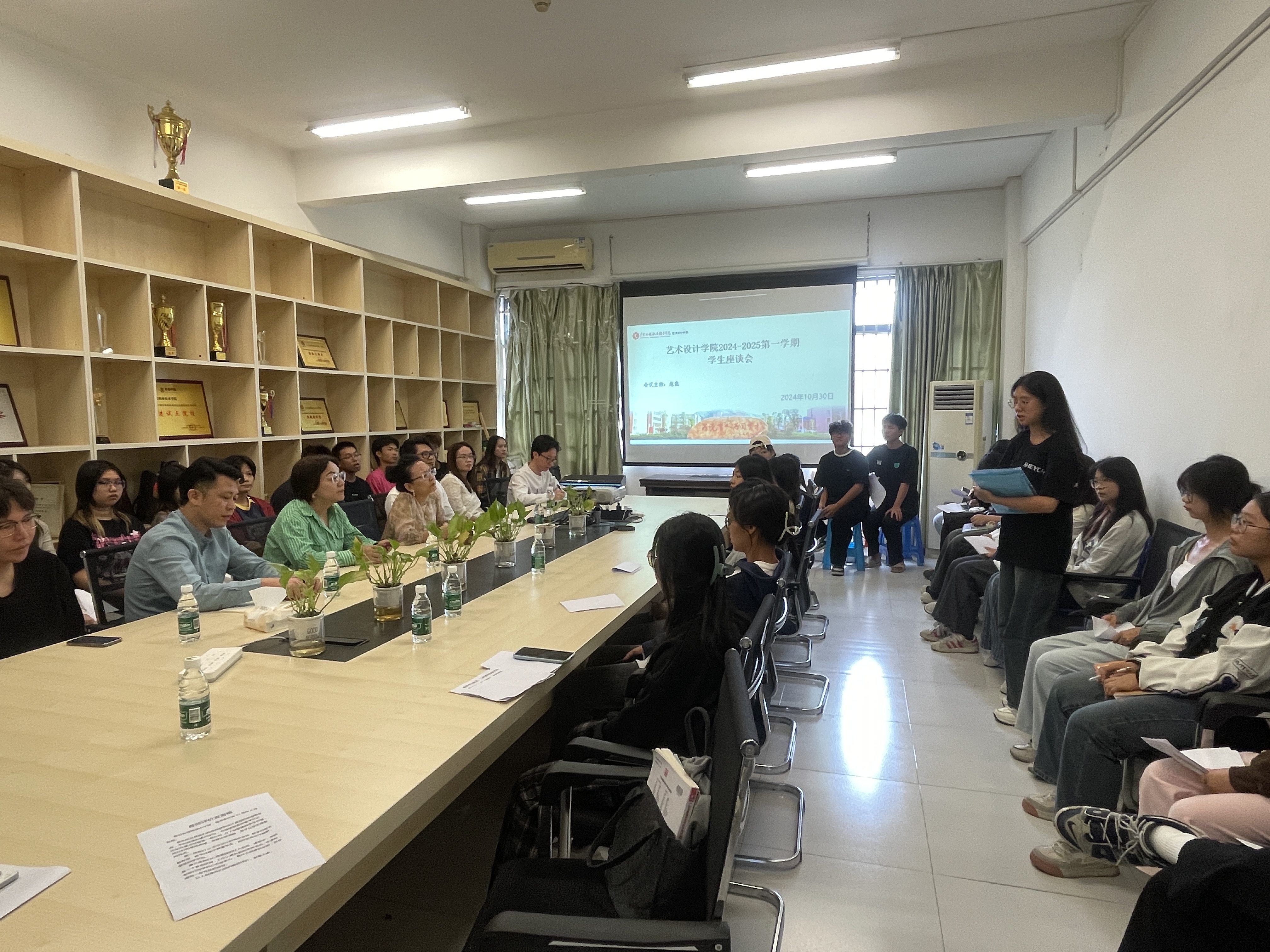 2024 年 10 月 30 日星期三,艺术设计学院在实训5-602室开展旨在促进教学质量提升、加强师生沟通的期中学生座谈会。出席本次会议的有艺术设计学院党委书记张华、艺术设计学院院长郭希、副院长施焦、党委副书记焦英,各专业带头人、教务老师陈钧禄和艺术设计学院全体在校班级的学习委员。大家齐聚一堂与学院领导和各专业带头人共同探讨半个学期以来在教学过程中出现的问题与改进方向。座谈会上,学委们积极发言,反馈了同学们在学习中遇到的各种困难和需求。