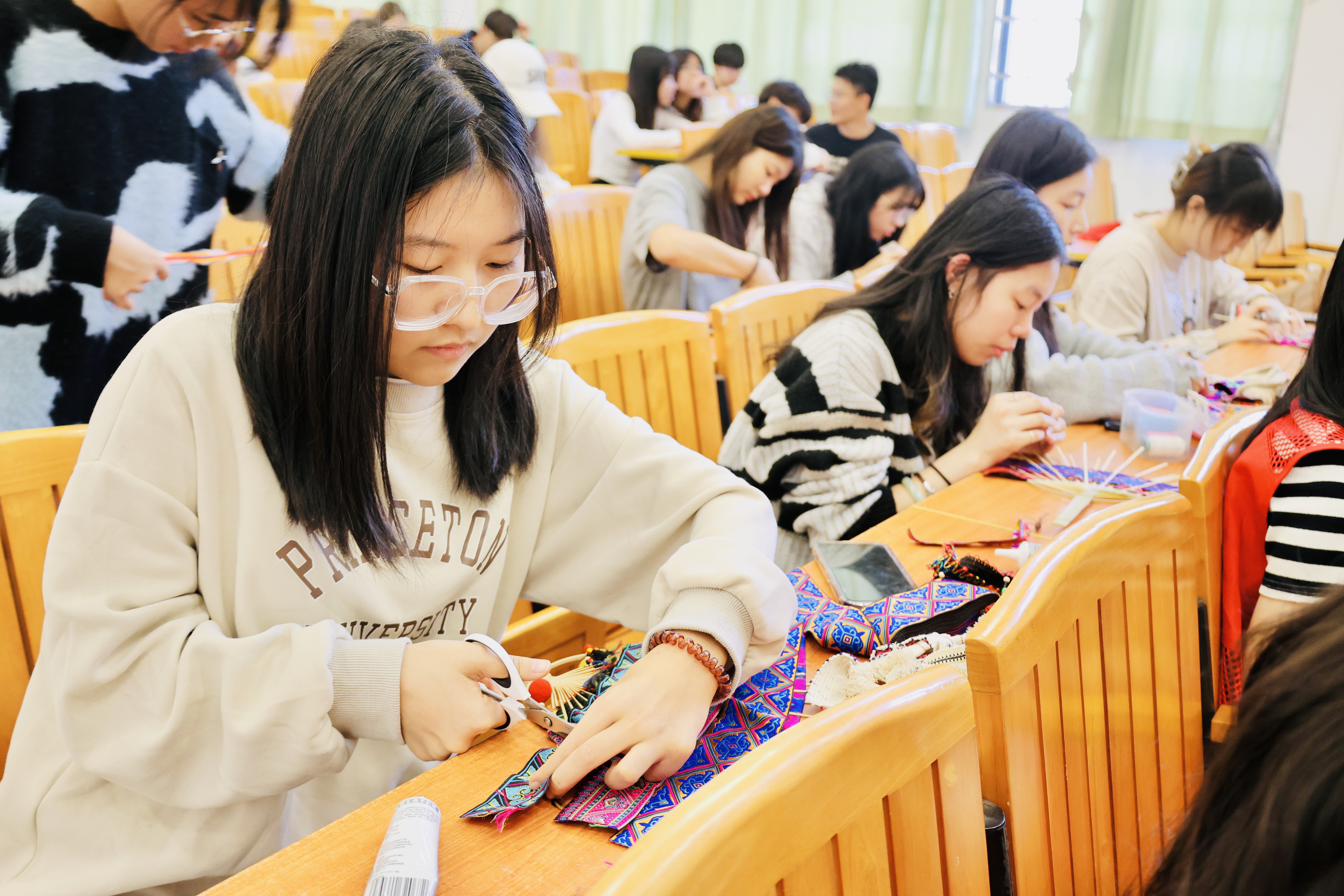 壮锦是广西壮族地区具有代表性的民族非遗手工艺品。是利用棉线或丝线编织而成的,图案生动,色彩斑斓,充满了热烈、开朗的民族格调,也是中国四大名锦之一。本次团扇活动有61名同学参与。活动现场,同学们不仅对团扇的发展历史、材质、形状、用途等方面进行了充分地讲解,还详细了解了本次团扇活动所用到的工具材料,鼓励同学们发挥奇思妙想,用一花、一叶、一妙手创作出兼具观赏性和实用性的团扇作品,传承中华非遗之美。