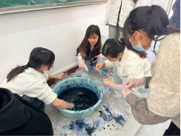 扎染是中国民间传统而独特的染色工艺。根据设计图案的效果,用线或绳子以各种方式绑扎布料或衣片,放入染液中,绑扎处因染料无法渗入而形成自然特殊图案的一种印花方法。本次扎染活动有161名同学参与,共提交了140份作品。通过扎、泡、染、拆、洗的创作过程,同学们感受到了来自随机变化的朴素美、创意美,体验了不同方式创作出多元的作品,同时高品质的专注力使同学们的意志品质有了很大提升。