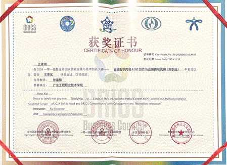 学生江希琦荣获2024一带一路暨金砖国家技能发展与技术创新大赛之首届数字内容AIGC创作与应用赛项全国总决赛三等奖;